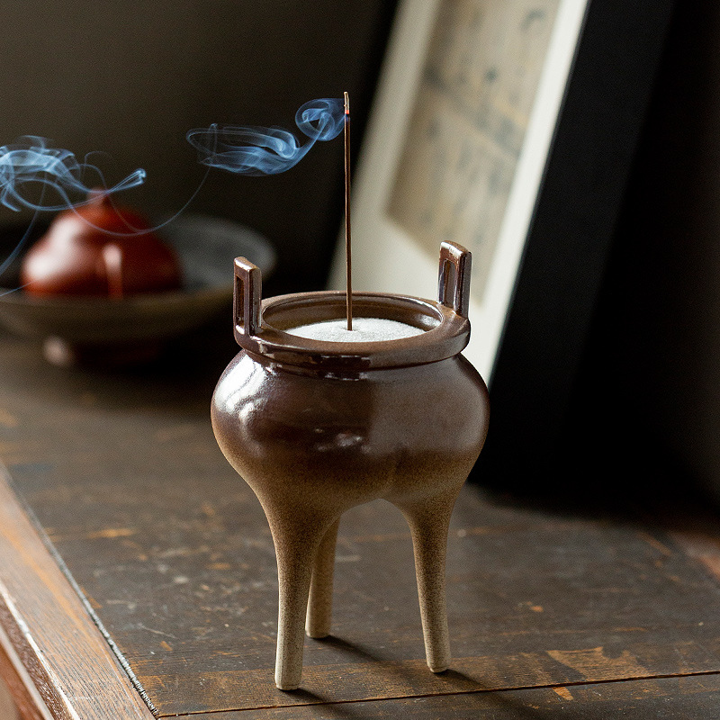 0 チャイニーズブラウン釉薬巡礼香炉中国風レトロ粗陶三脚香炉家庭用線香沈香香炉