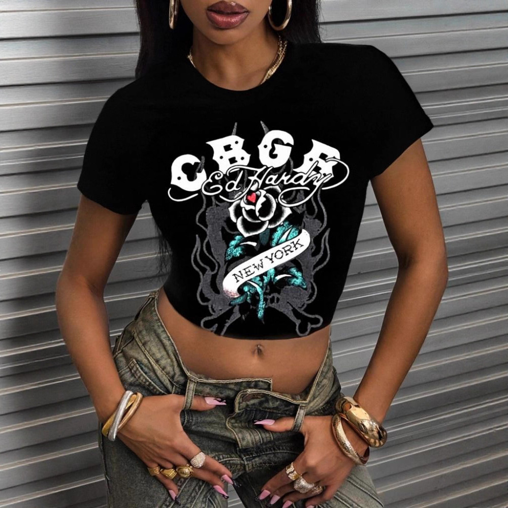 跨境欧美女装新品跨境肚脐T 印花短袖