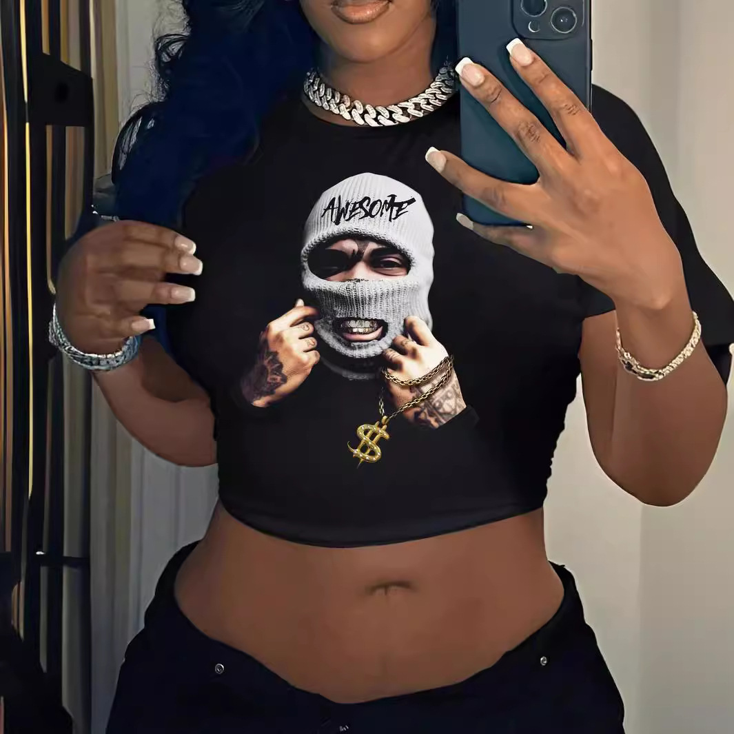 24新商品欧米クロスボーダーアマゾン臍Tヘッドプリント半袖