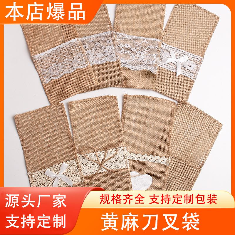 工場直販レースカトラリーバッグ結婚式クリスマスお祝いパーティー装飾天然ジュートカトラリーバッグ