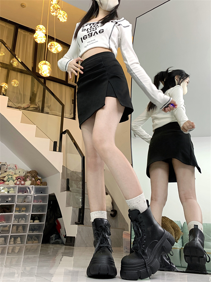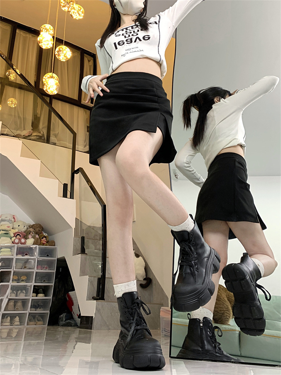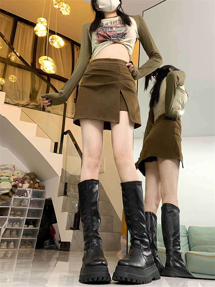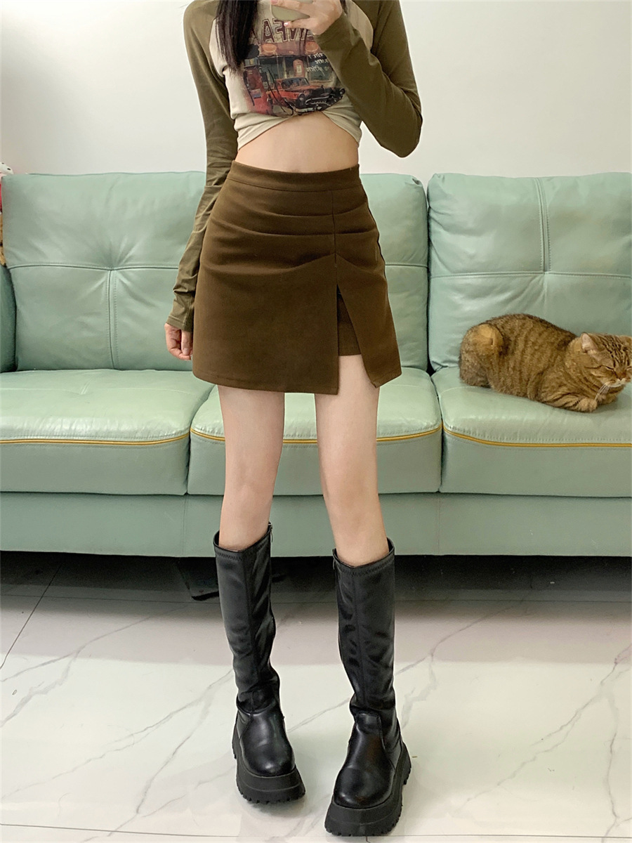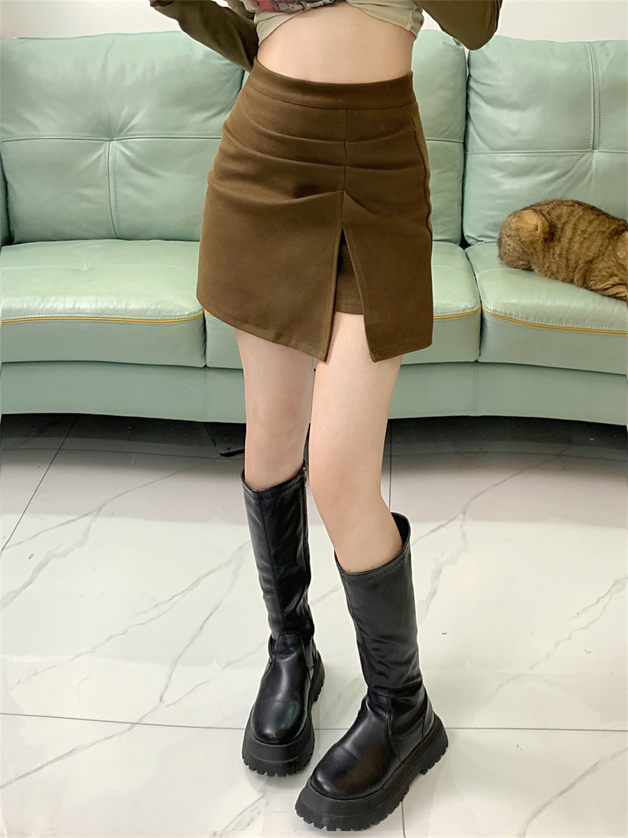 秋の大きいサイズのぽっちゃり女子向けスリット入りウールスカート、セクシーなAラインショートスカート、ハイウエストで細見え効果のあるプリーツ入りヒップスカート