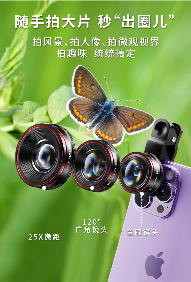 新品多功能手机镜头广角鱼眼微距3合1组合外置自拍金属摄像镜头