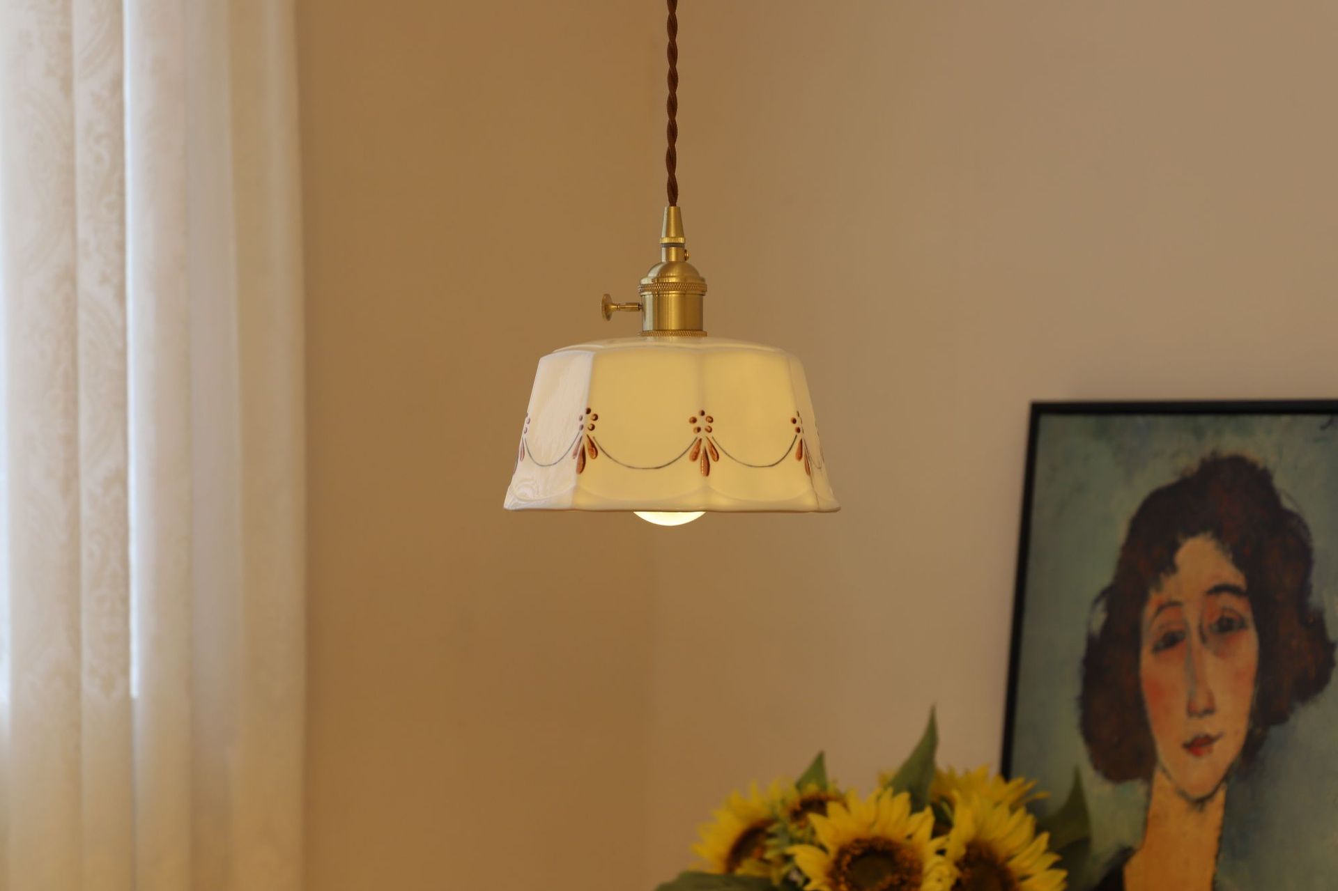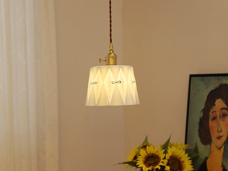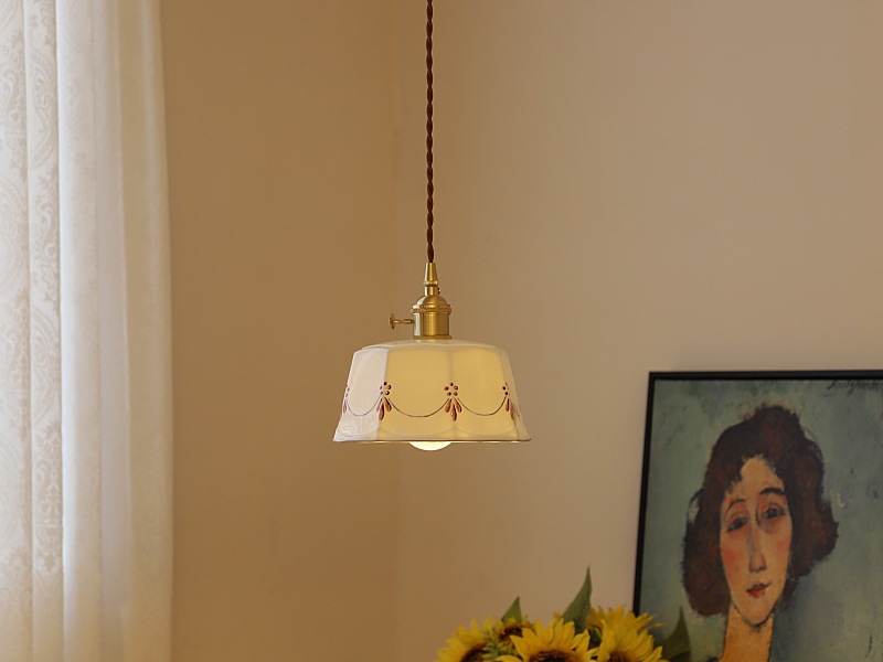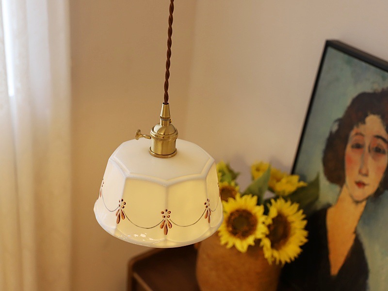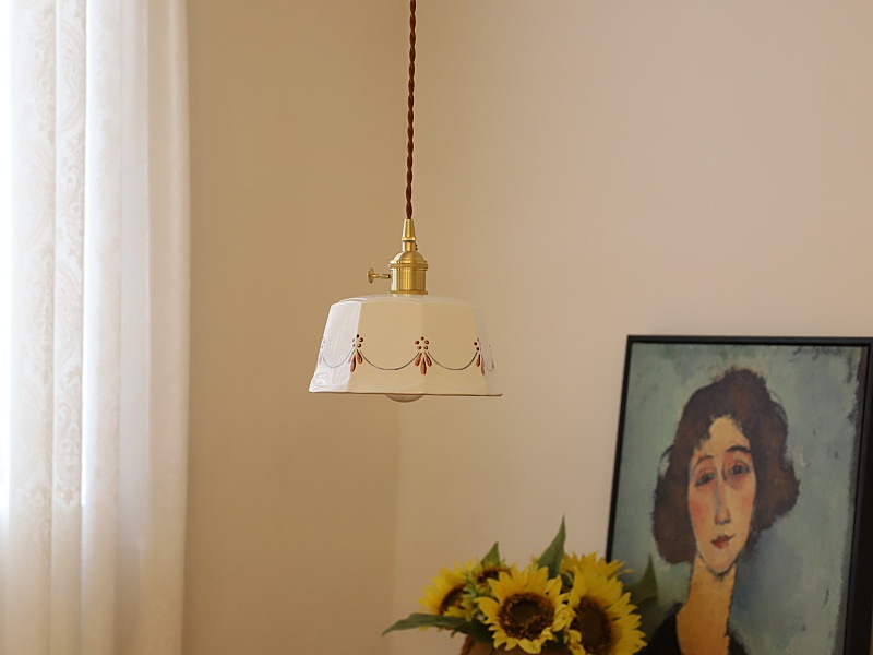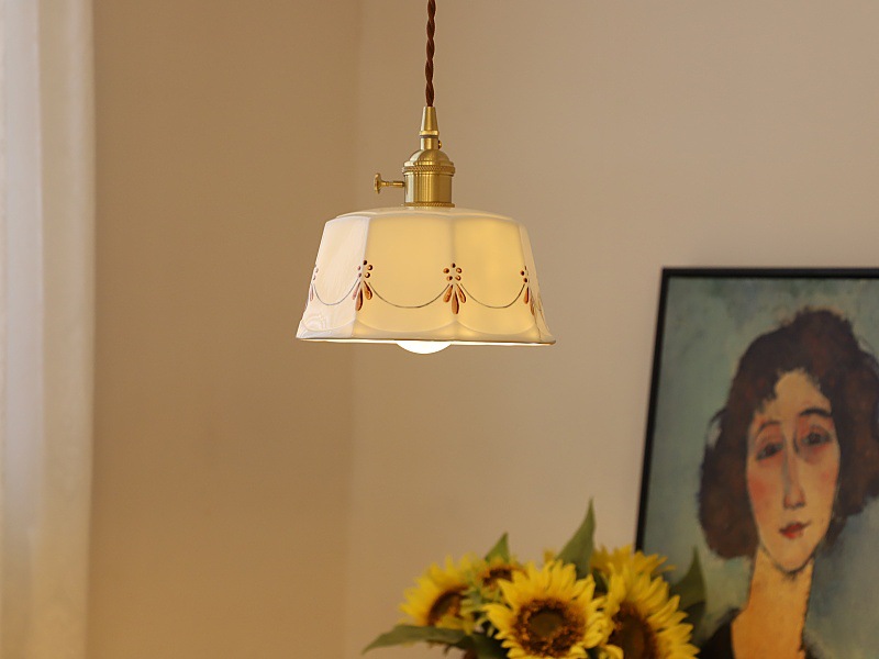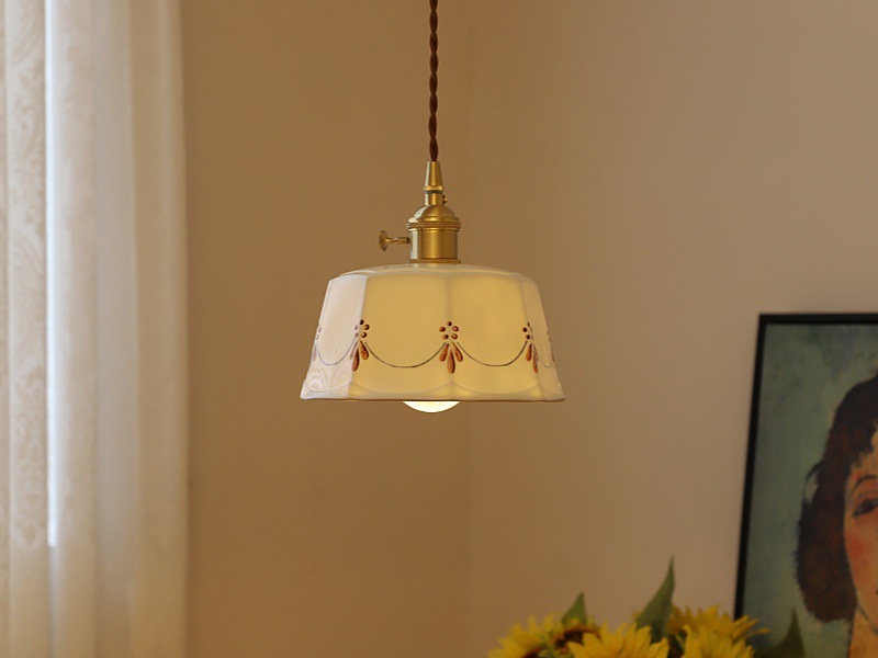 关于材质:这款釉面手绘陶瓷黄铜吊灯,汇集了师傅满满的心血,每个花瓣都是手工绘画后烧制的,釉面光滑精致。白色陶瓷晕染田园小碎花灵动可爱。灯头国标H65黄铜材质,灯头带开关灯头墙壁双控。两个款式供大家选择。