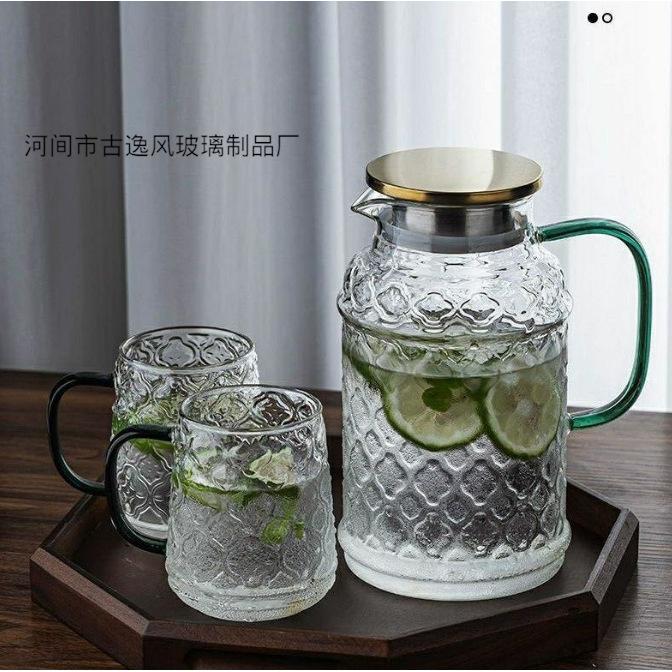 レトロな海棠模様の冷水筒、高硼珪酸ガラス製、家庭用大容量冷水筒セット、カップ付き、耐高温・低温