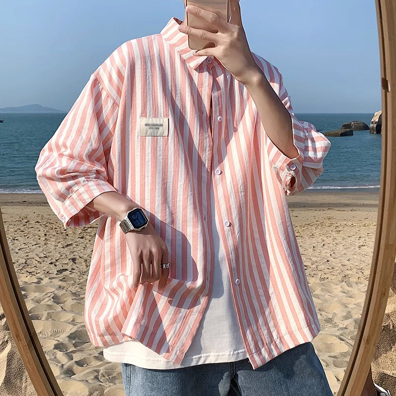 夏の新型のゆったりとしたカジュアルなファッションシャツのシャツの薄い半袖の上着のコートのストライプのデザインの青春の潮流