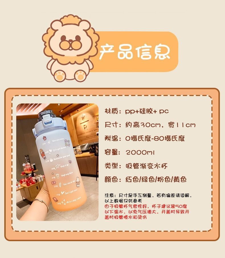 2000mlスポーツカップ女性夏フィットネスストロー付き大水筒携帯耐高温プラスチックカップ大容量
