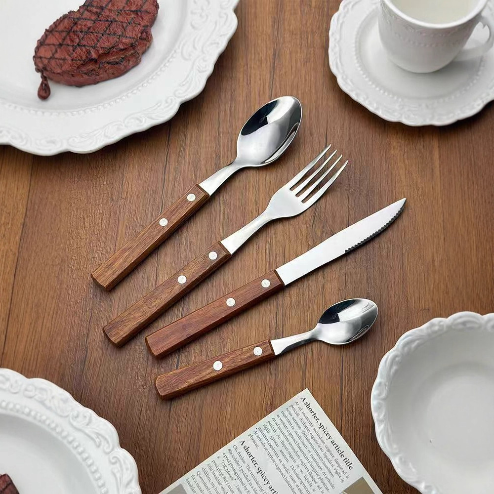 クロスボーダーステンレス鋼のナイフ、フォーク、スプーンカトラリーセット木製ハンドル洋食器ホームホテルステーキナイフとフォークデザートスプーンとフォーク