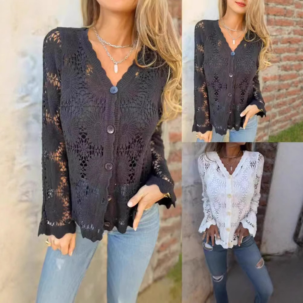 2025年クロスボーダーアマゾン春秋新作ゆったりおしゃれ万能中空レースVネックシングルブレスト長袖シャツ