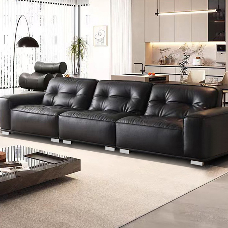 意式极简真皮沙发直排高级感客厅沙发软装别墅黑色高端黑金刚沙发