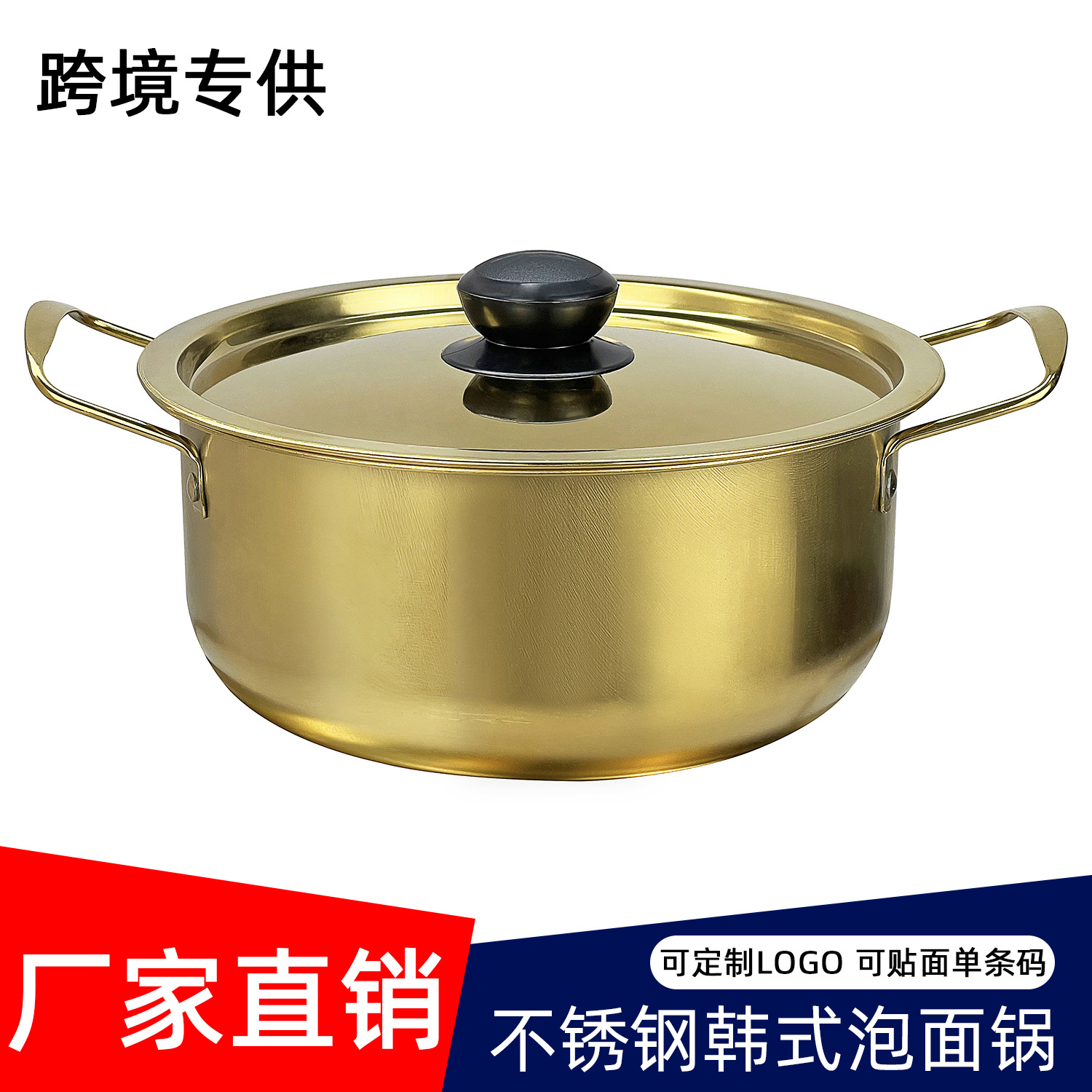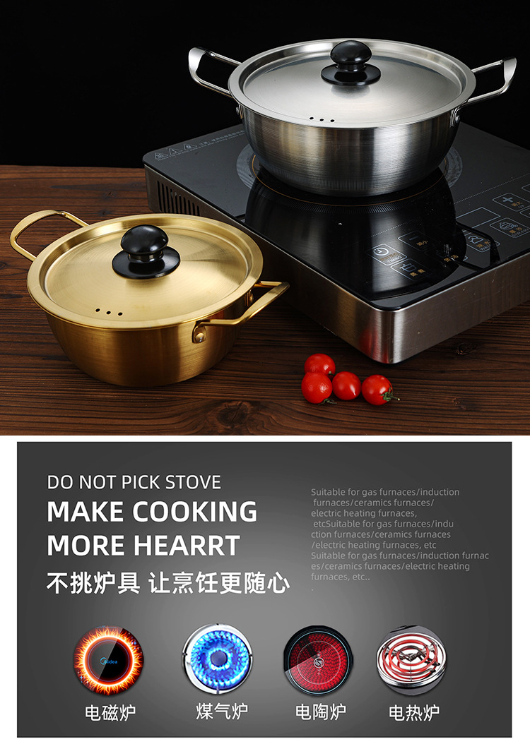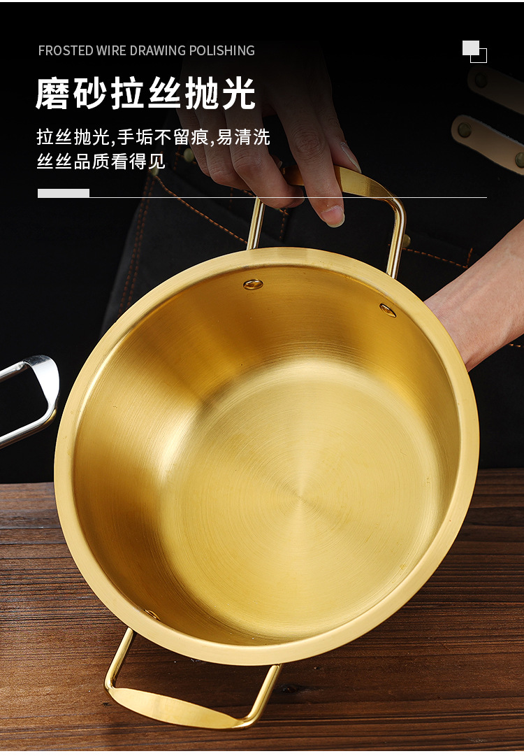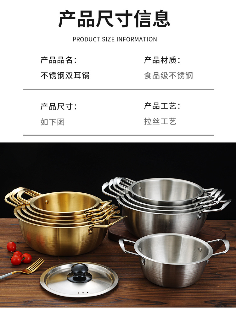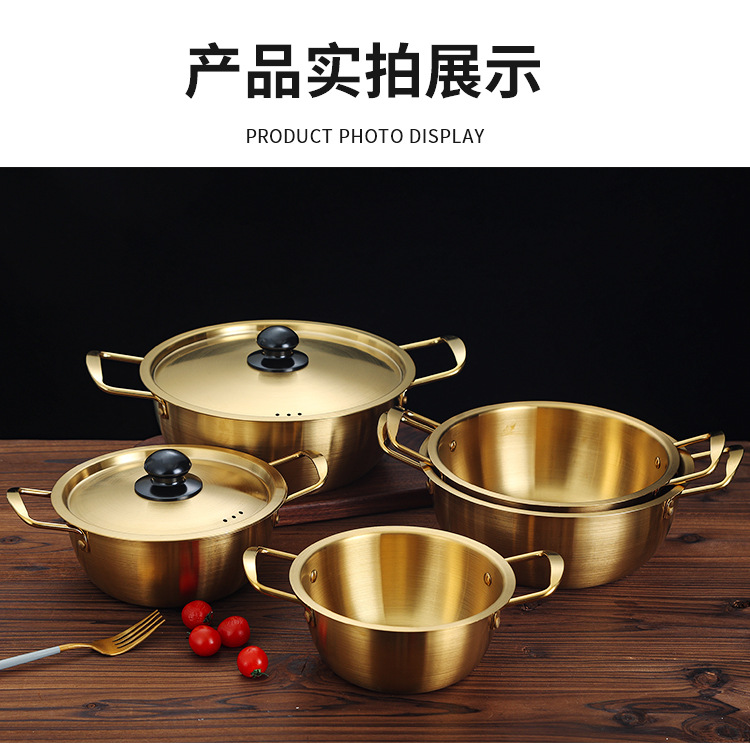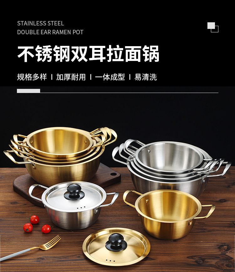 跨境批发韩式泡面锅不锈钢加厚金色拉面锅带盖双耳煮面小汤锅pot
