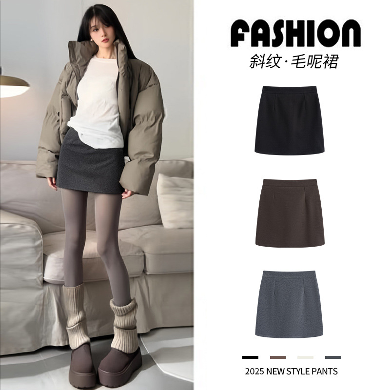 灰色斜纹毛呢短裙女秋冬2026新款辣妹高腰a字半身裙小个子包臀裙