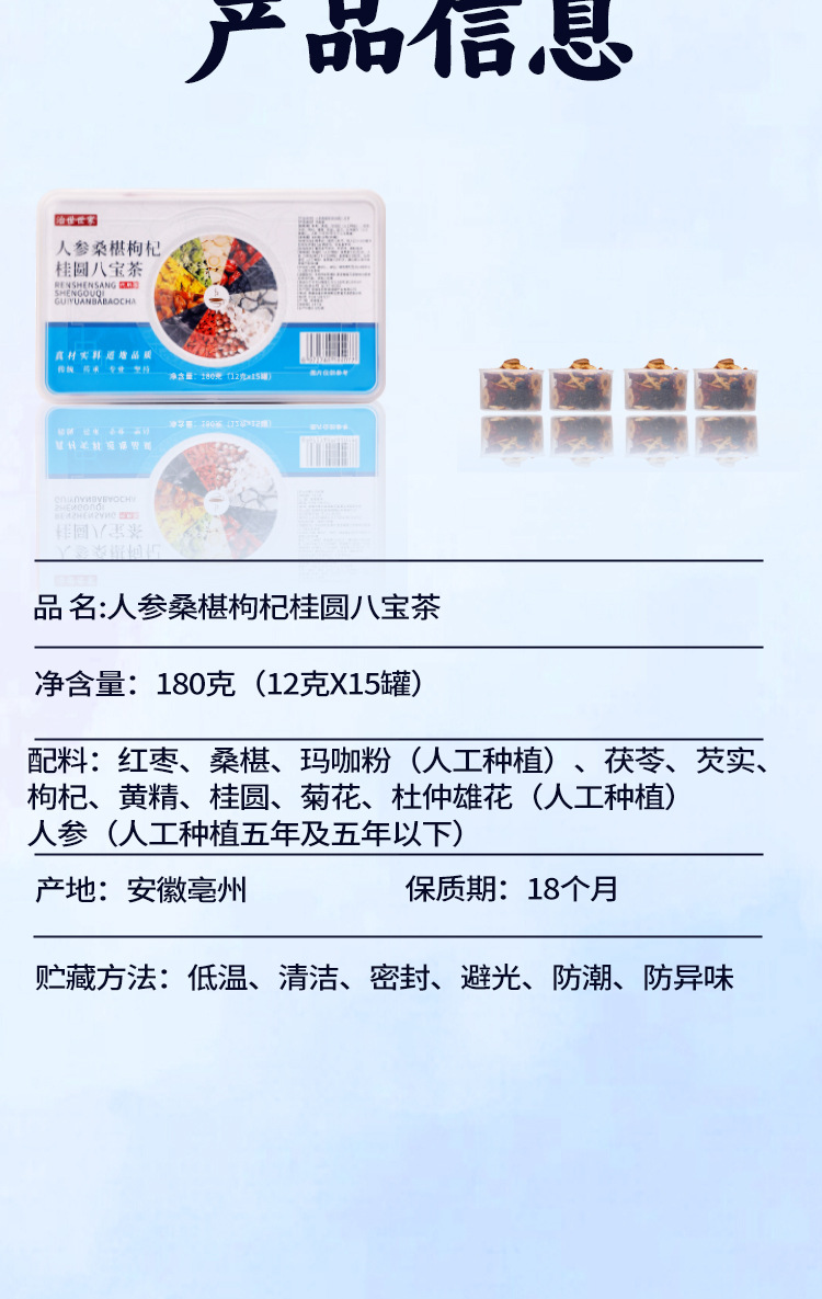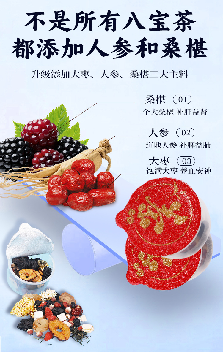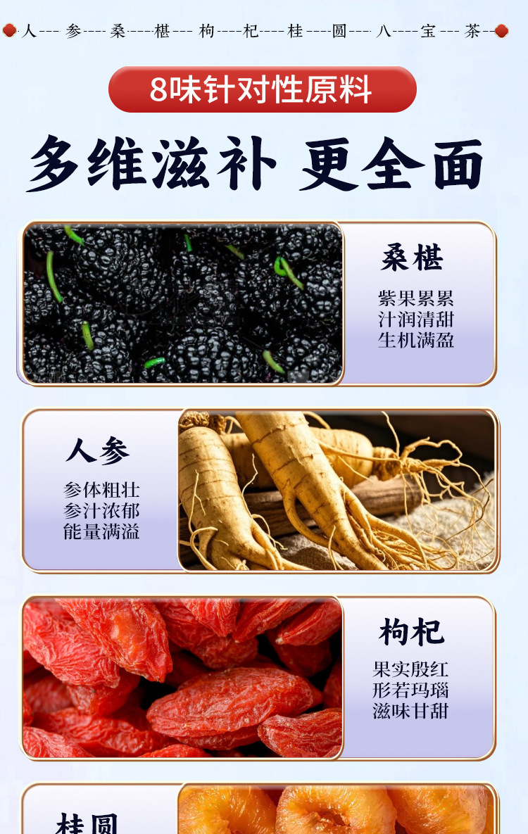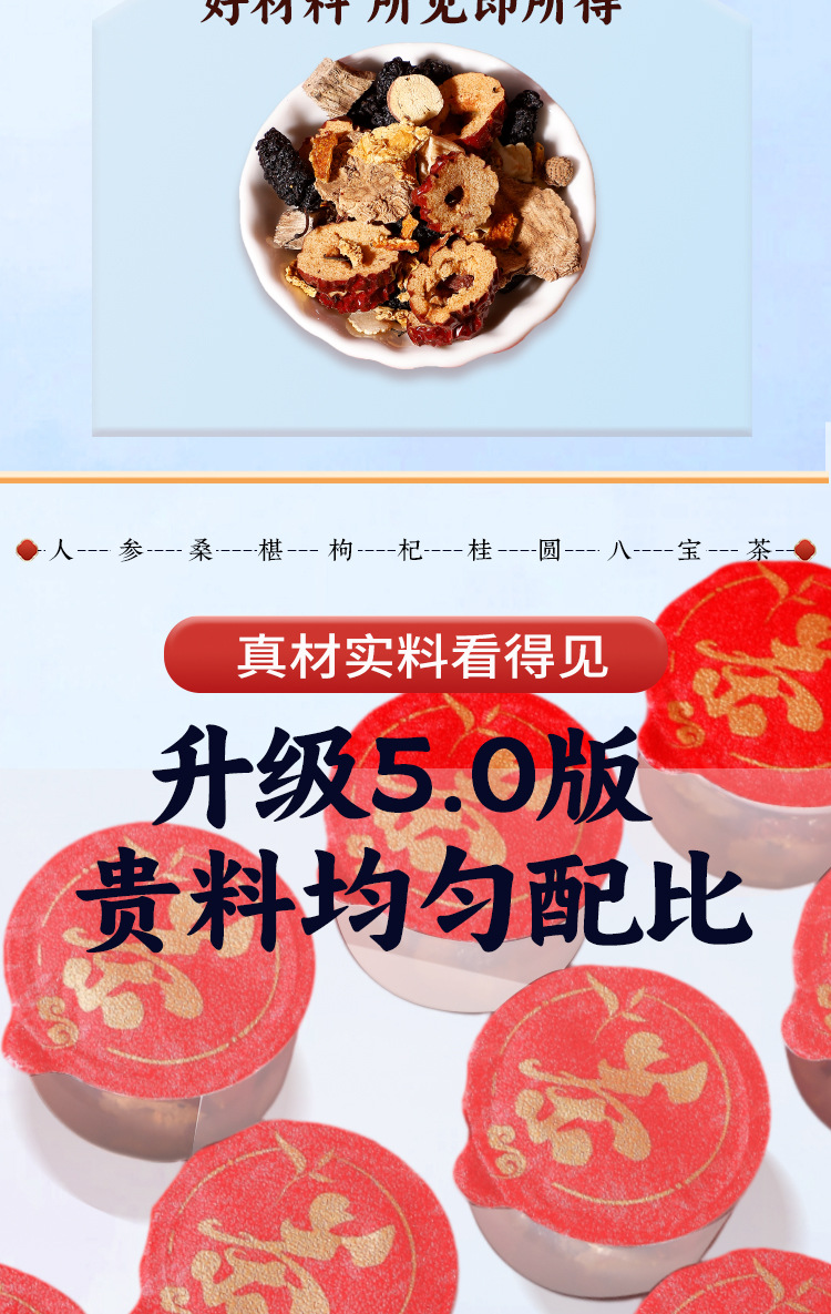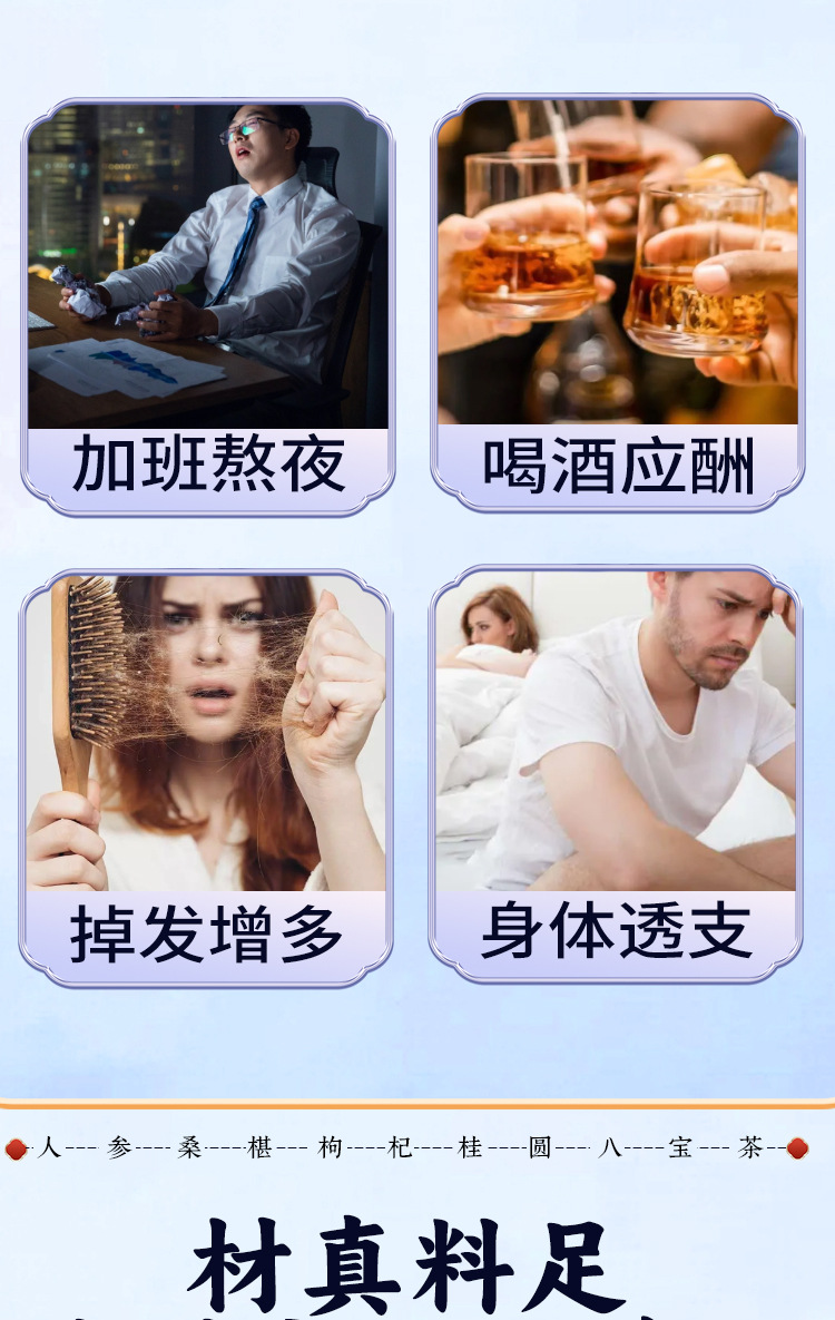 原材料と原材料 赤いナツメヤシ、桑の実、マカ粉、ポリア、ゴルゴン、クコ、タデ、リュウガン、菊、杜仲雄花、高麗人参