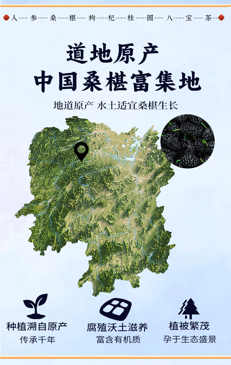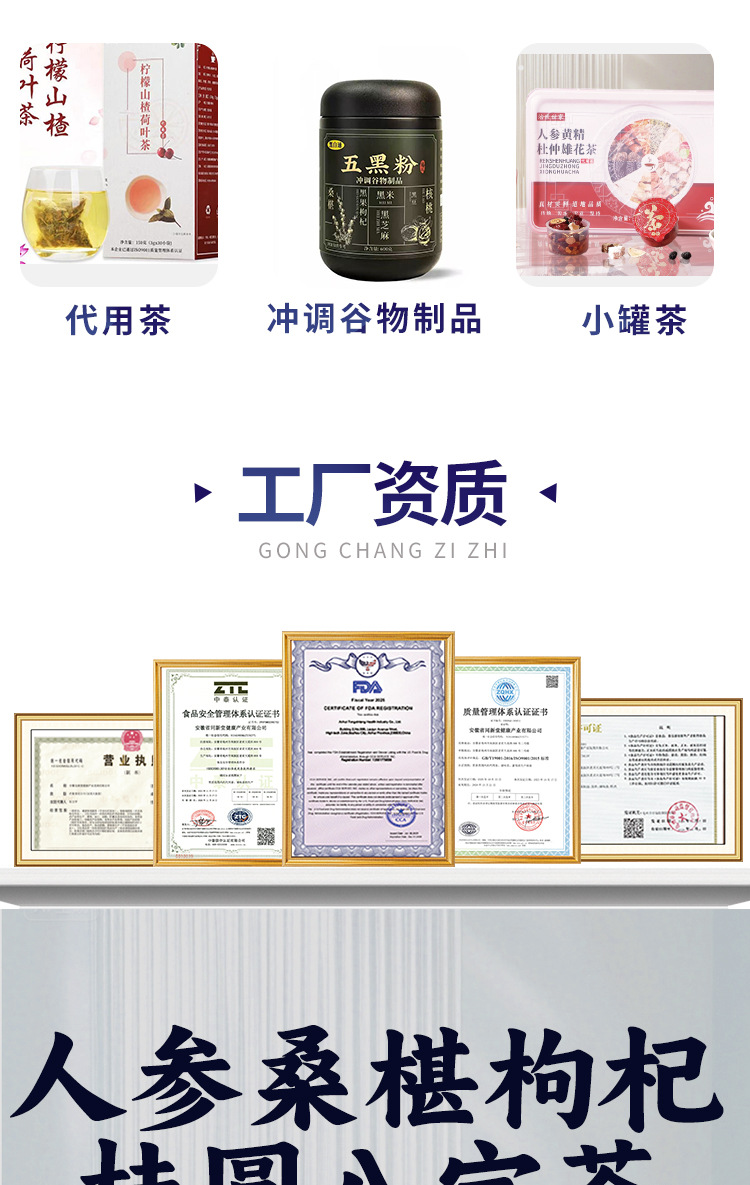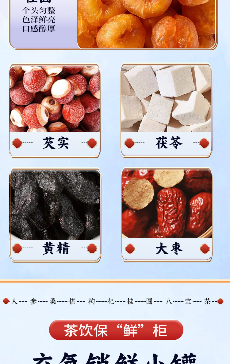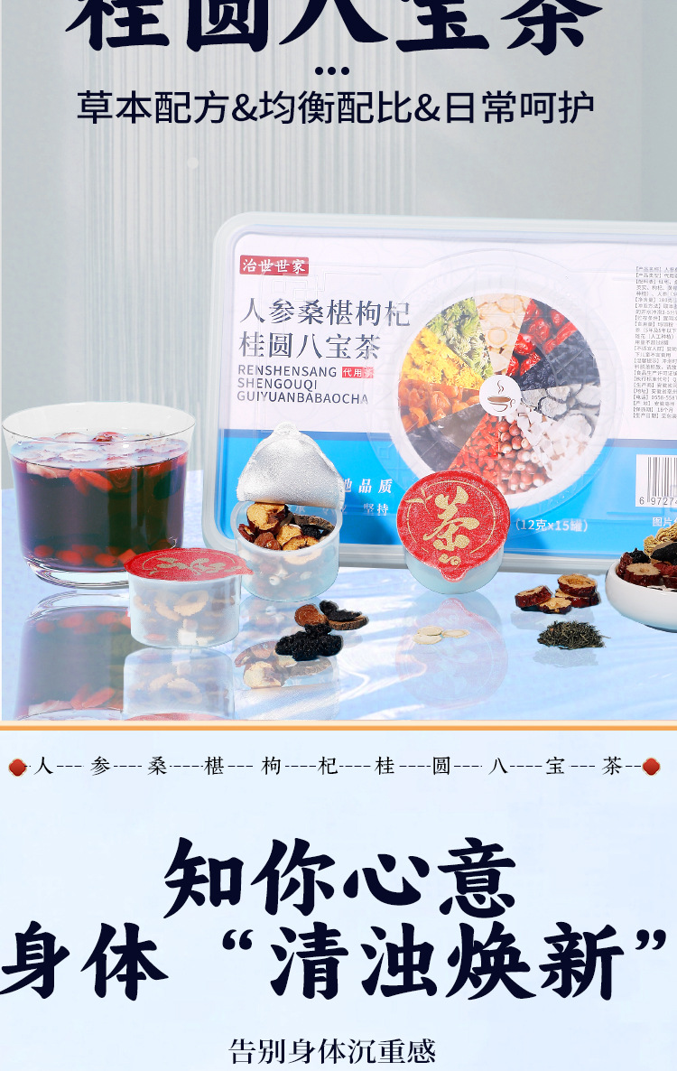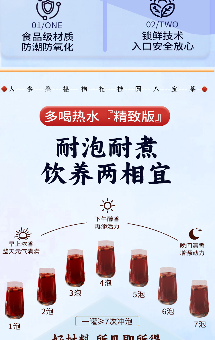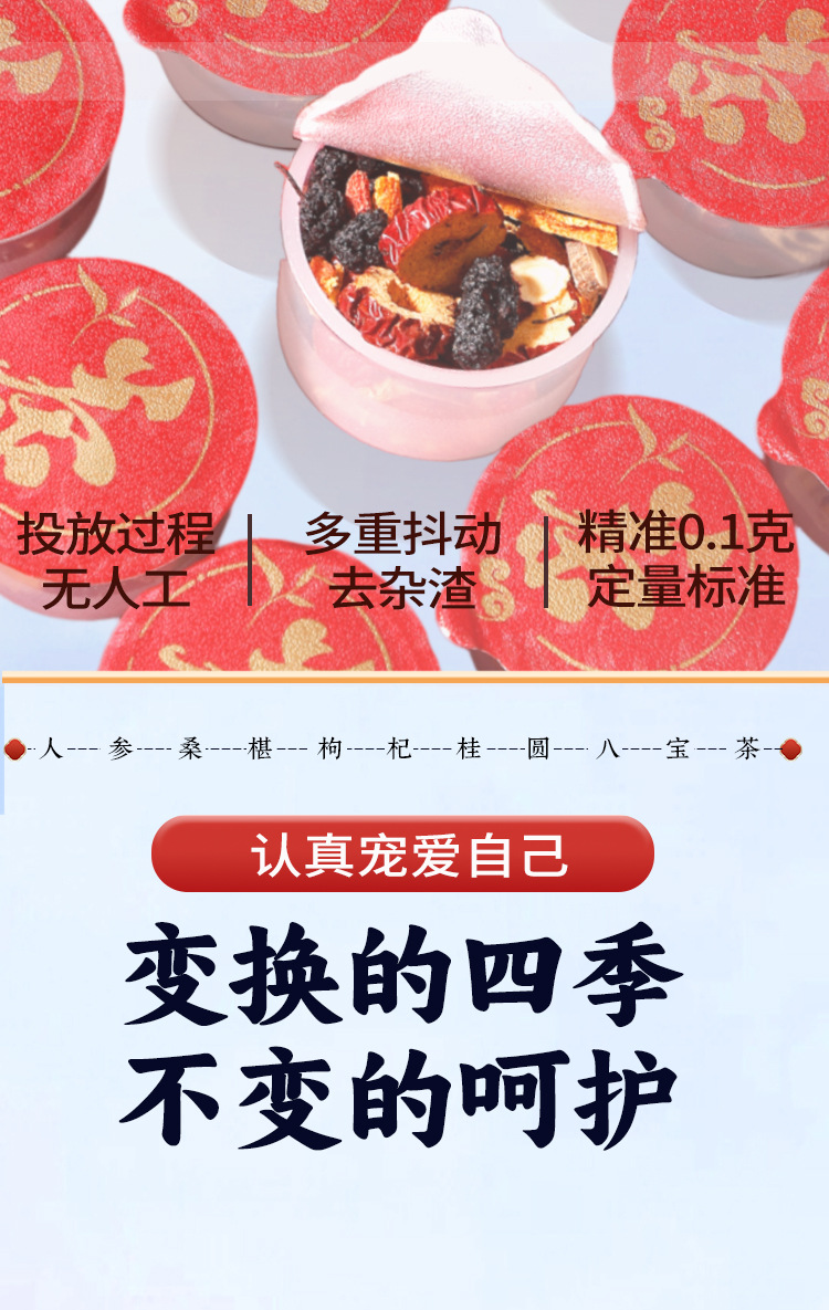 原材料と原材料 赤いナツメヤシ、桑の実、マカ粉、ポリア、ゴルゴン、クコ、タデ、リュウガン、菊、杜仲雄花、高麗人参