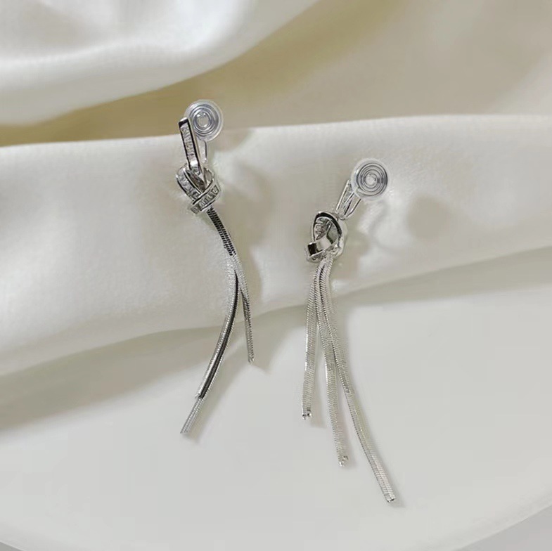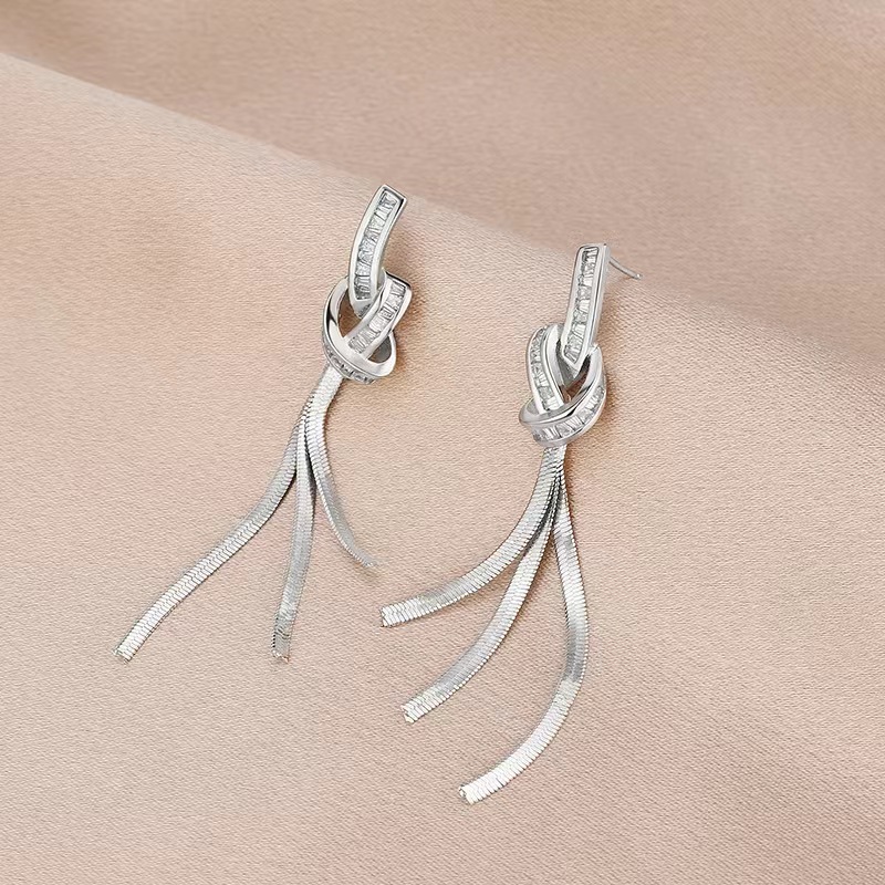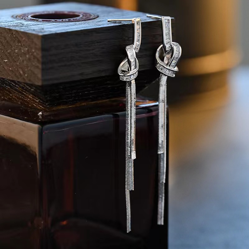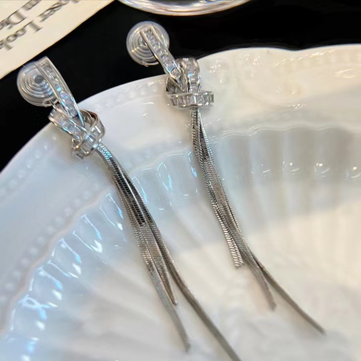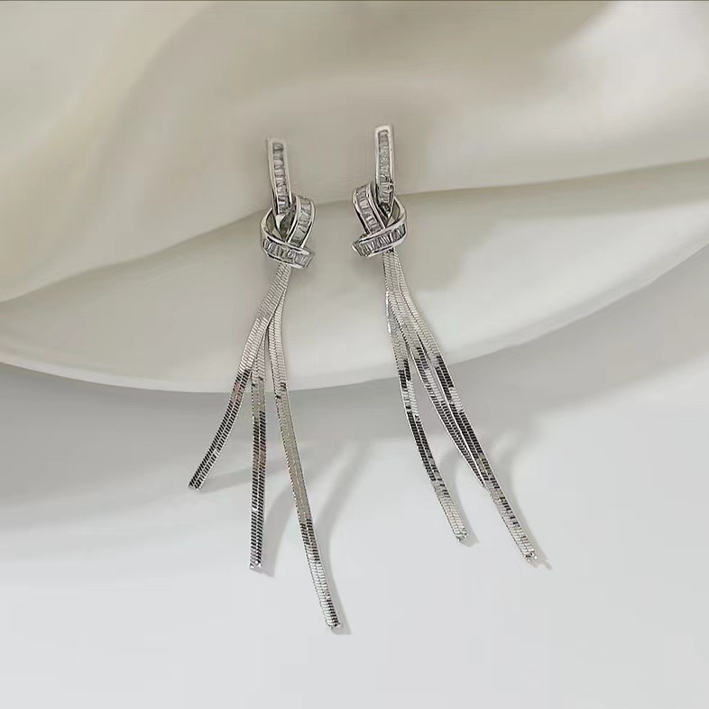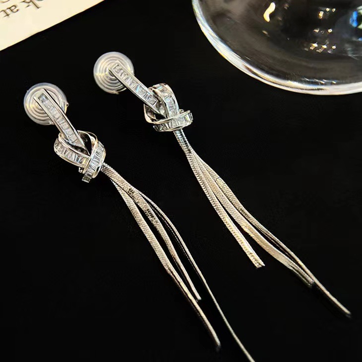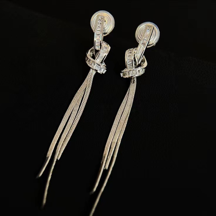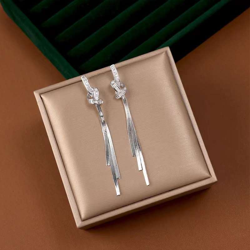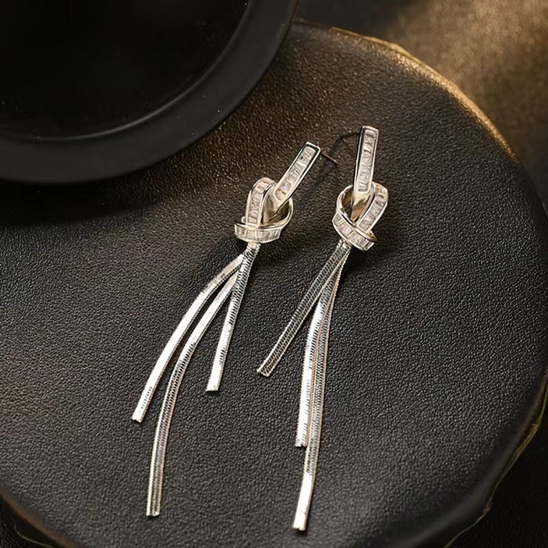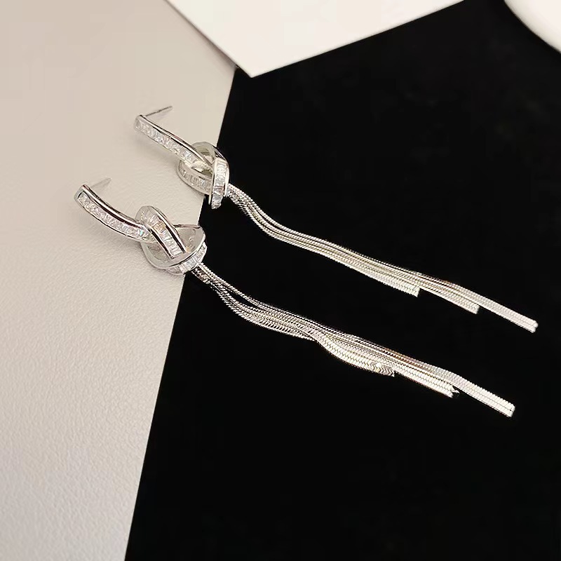 925 シルバー針ロングタッセルジルコンイヤリング女性のためのトレンディなライト高級ニッチ多用途気質リボンイヤリングイヤリング