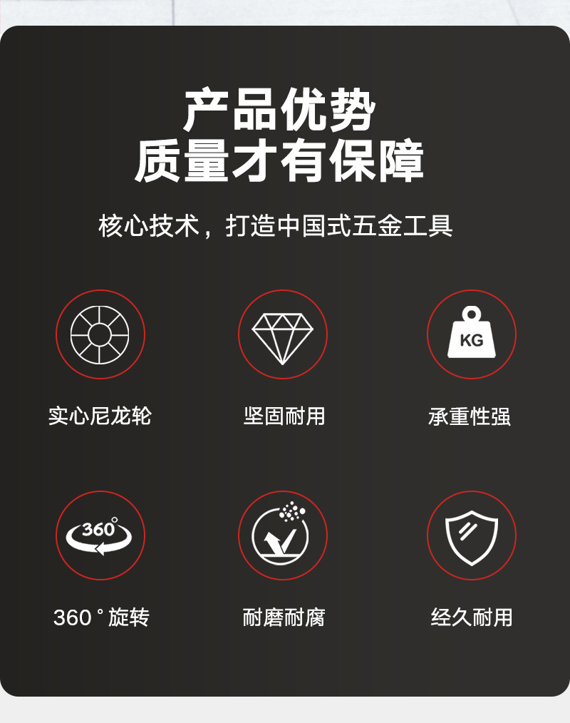 荷重キャスターの重さは3インチ2インチの万能車輪で、ブレーキ付き4インチの工業用荷重ナイロン車輪の荷重は3トンです。