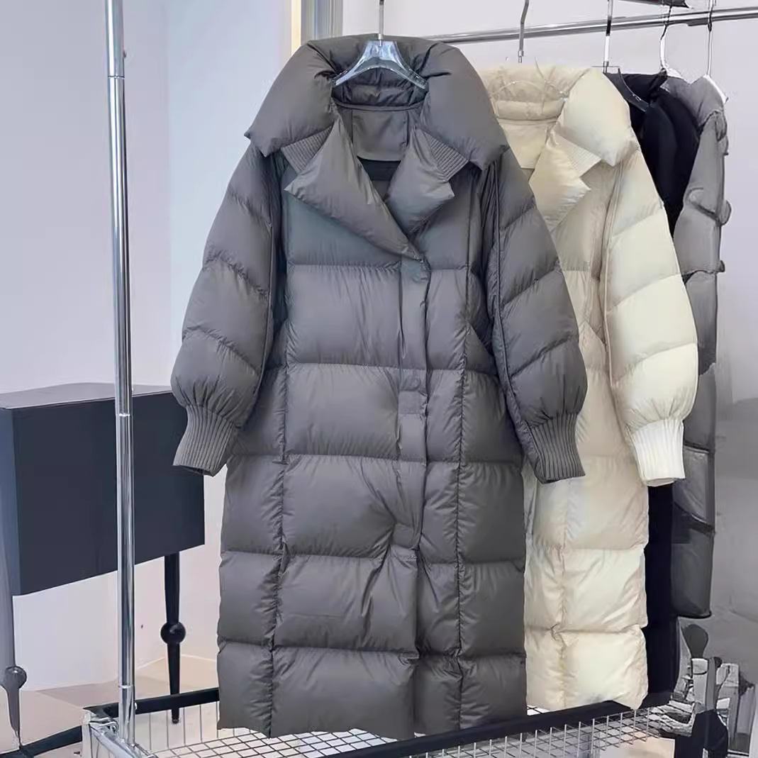 韓国版高級ダックダウンジャケット レディース ロング丈 膝丈以上 高級大判ダウンジャケット 冬用 暖かい おしゃれ ラペル付き ホワイトダックダウンジャケット