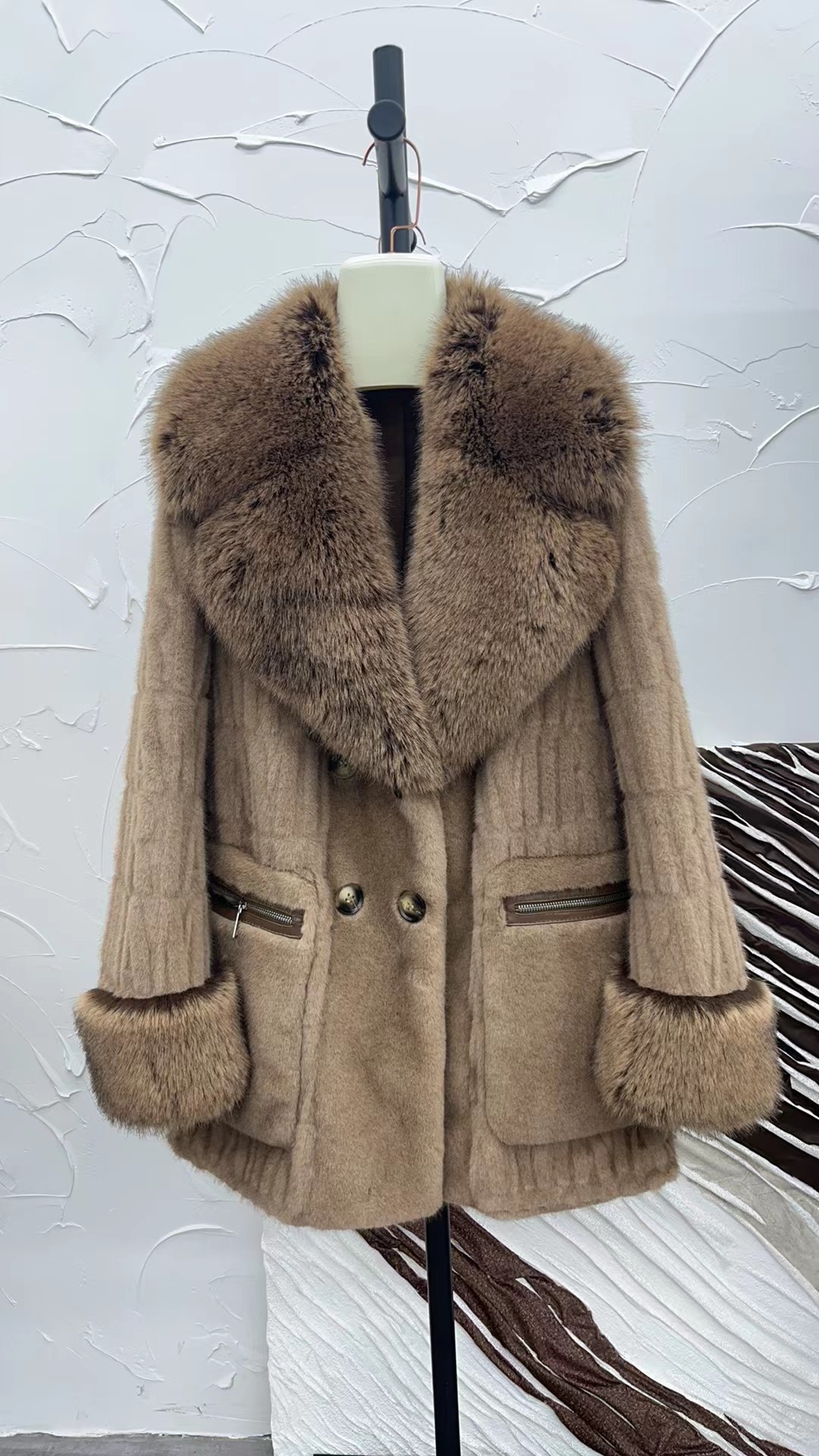 2025 新しいファッショナブルで多用途なルーズストラップフード付きフォックスファーハイエンド両面ウールコートジャケット女性用