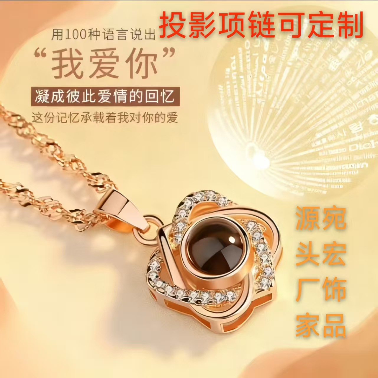 カップルのネックレスのバラの金の愛の100言語の投影のloveはダイヤモンドの愛の彫刻の指輪を入れて石のネックレスを投影します。