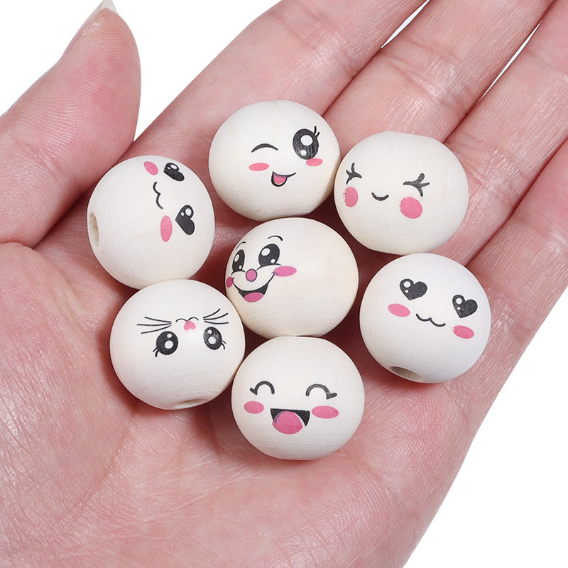 アマゾンで人気の笑顔の表情が描かれた20mm木製ビーズ、蓮の木の原木色の表情ビーズ、人形の頭の形をしたビーズ、遊び心のある顔