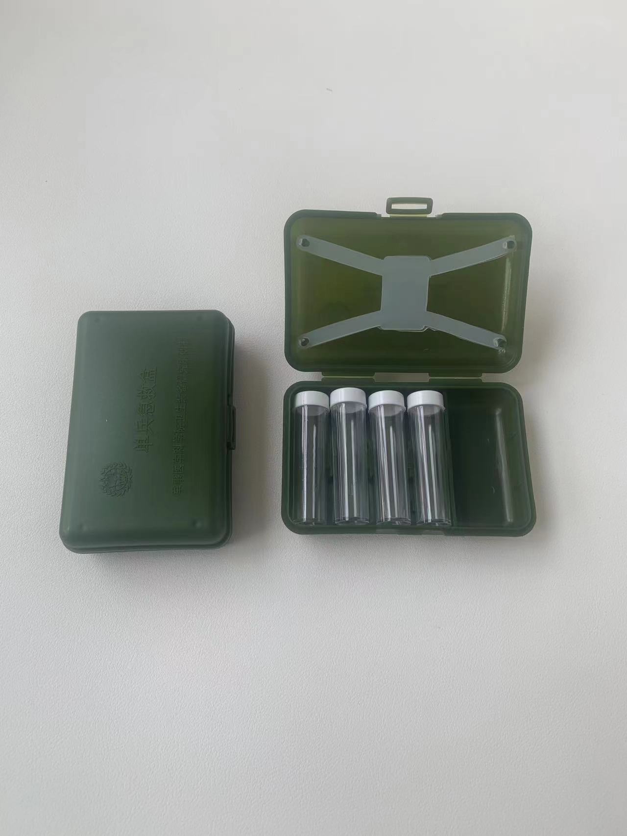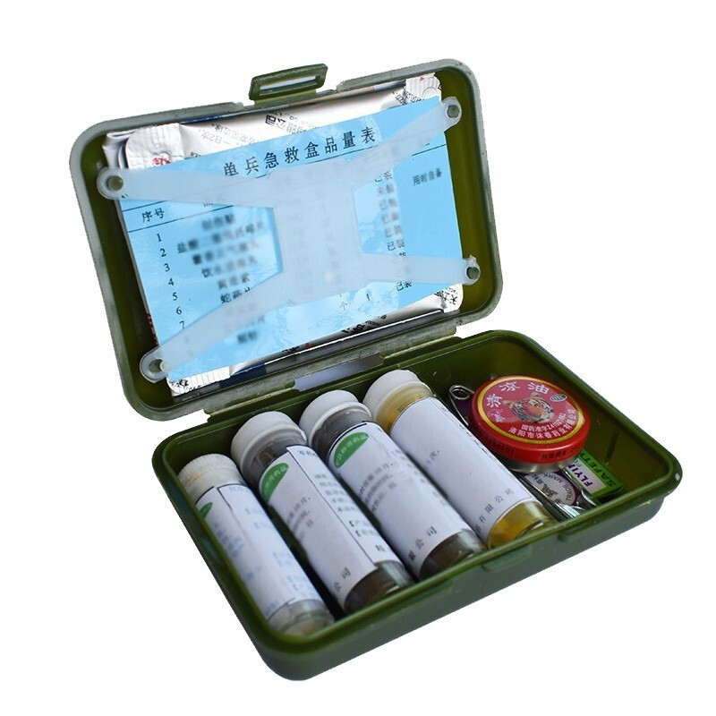 盒内主要装备有饮水消毒片、安全刀片、别针、创伤贴等常用药、材。总质量不大于100克。