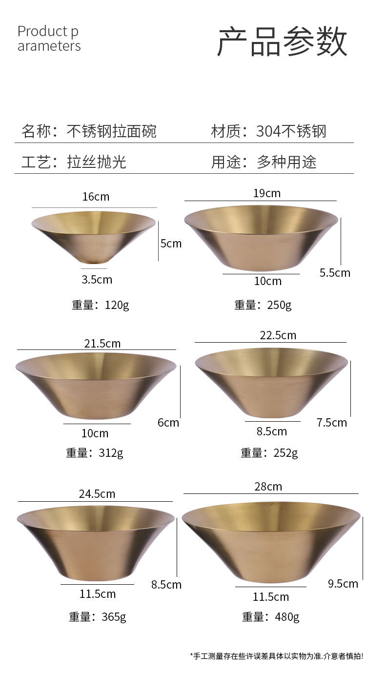 韓国式冷麺碗ステンレス碗家庭用金色単層ラーメン碗スープ碗業務用板面練飯碗サラダ碗