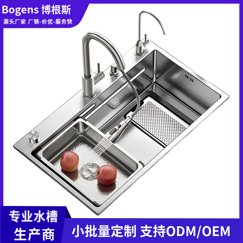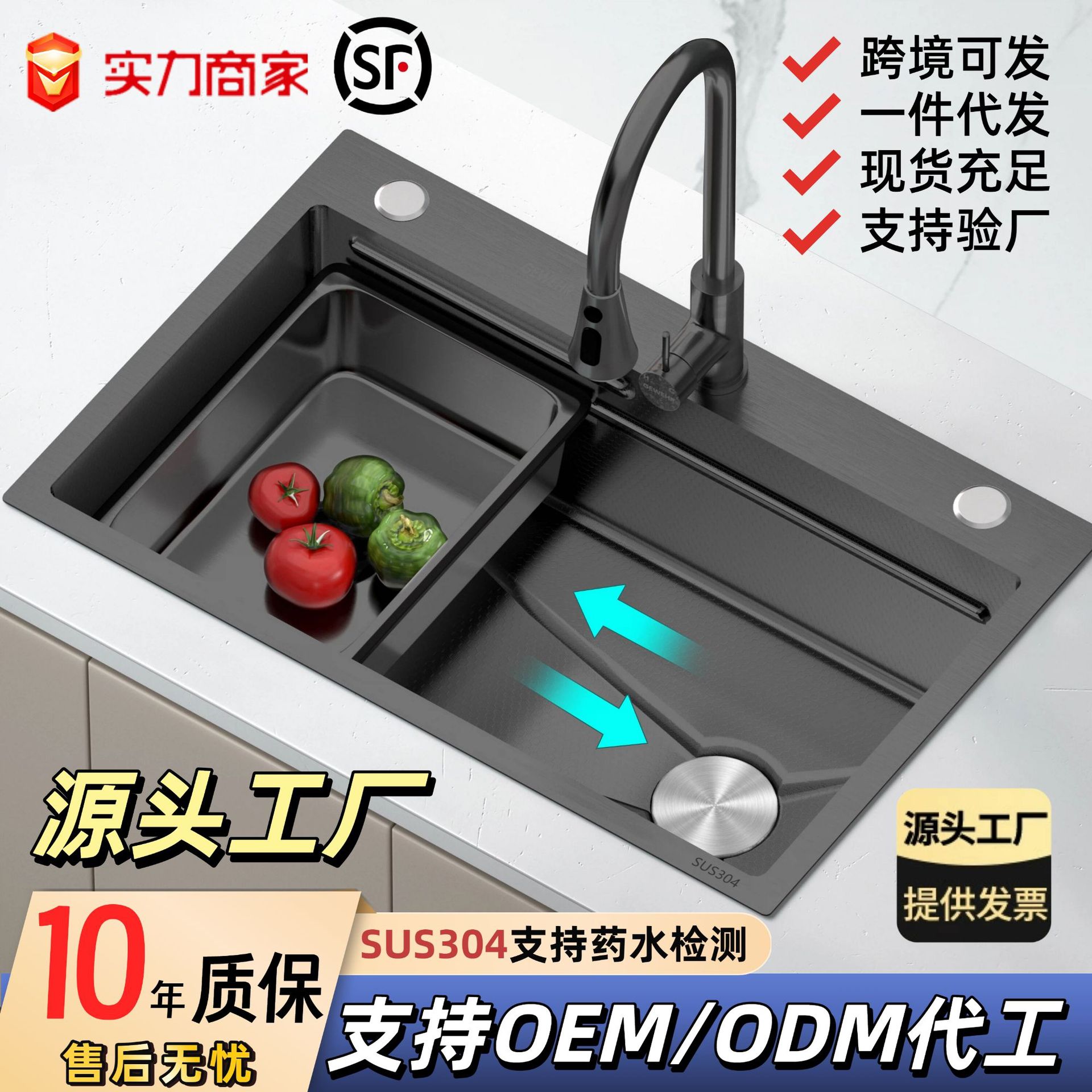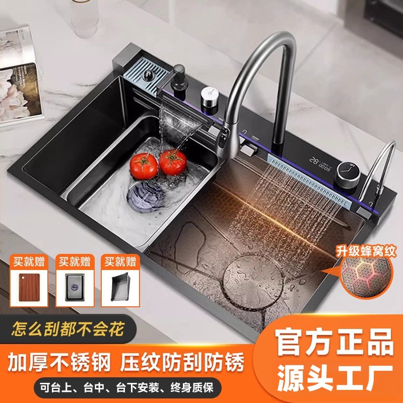 外贸鲸鱼钢琴数显飞雨瀑布水槽大单槽蜂窝纹304不锈钢厨房洗菜盆