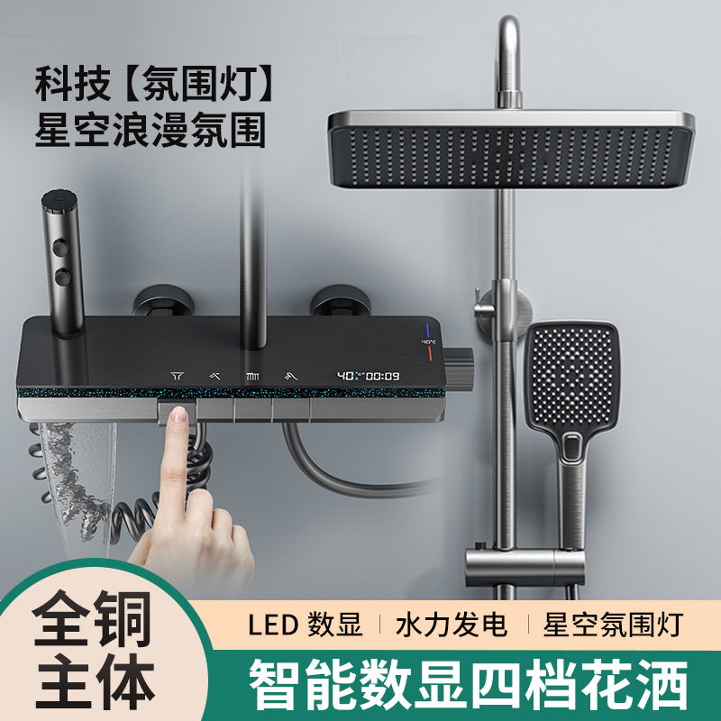全銅シャワーシャワーセット家庭用恒温デジタル表示増圧シャワー浴室トイレ雰囲気ランプ混水弁