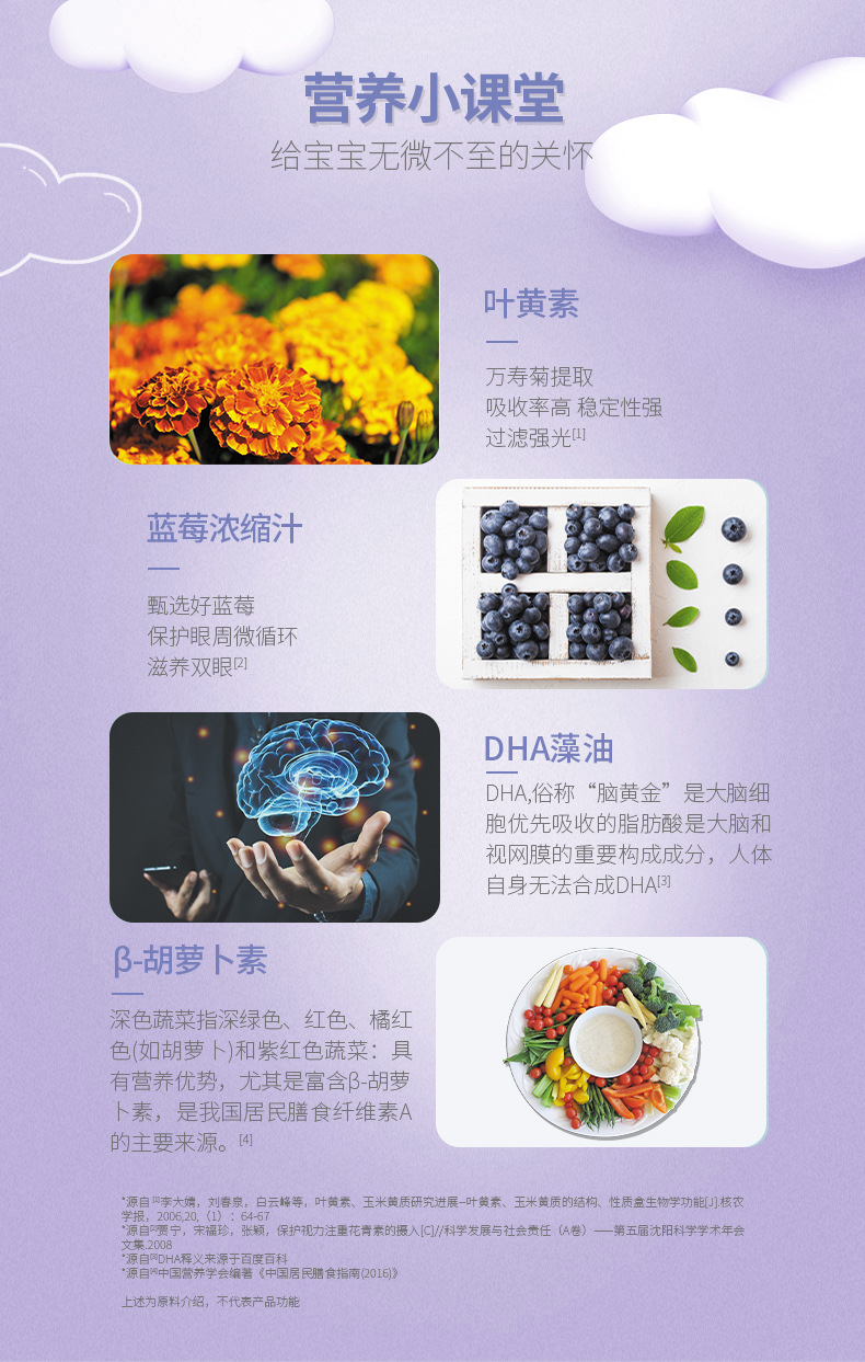 主な原材料 藻類油DHA、ブルーベリー、ルテイン、カロテンなど