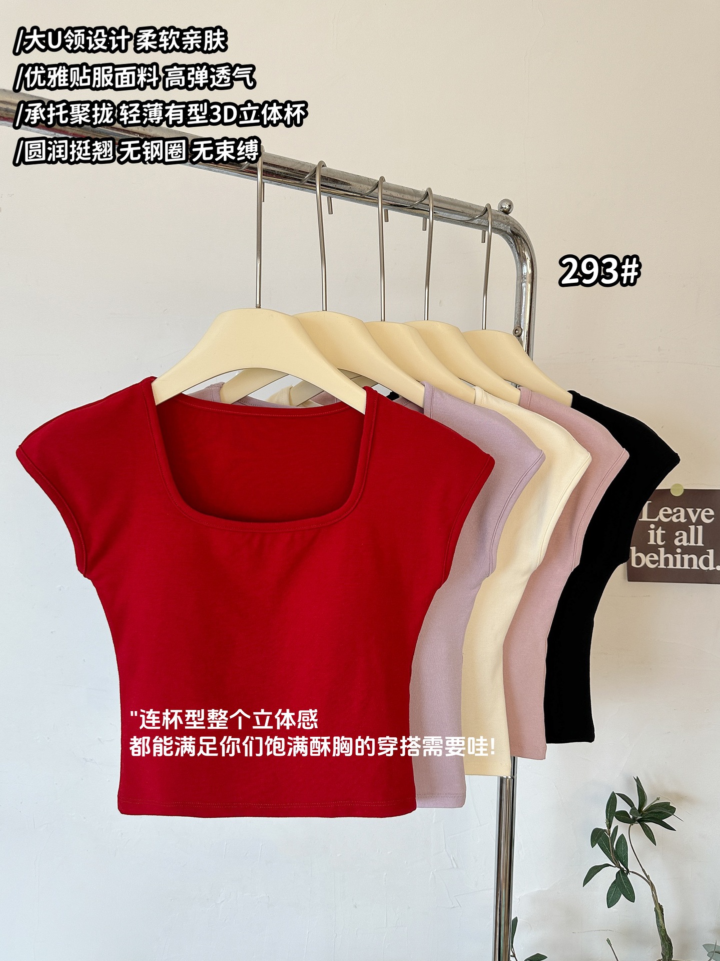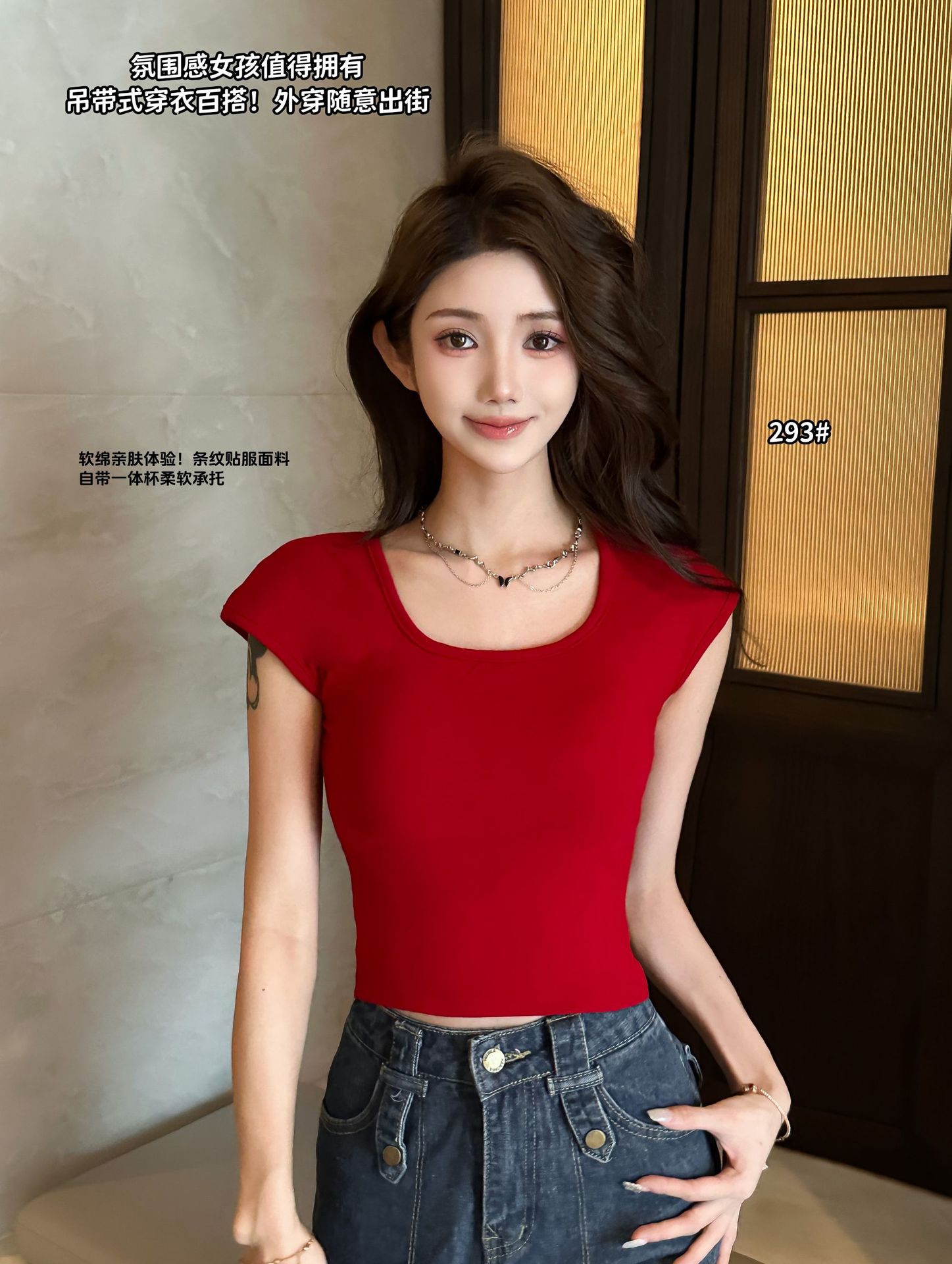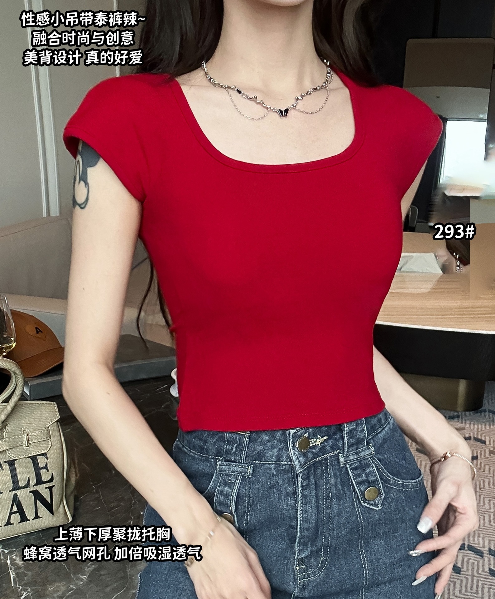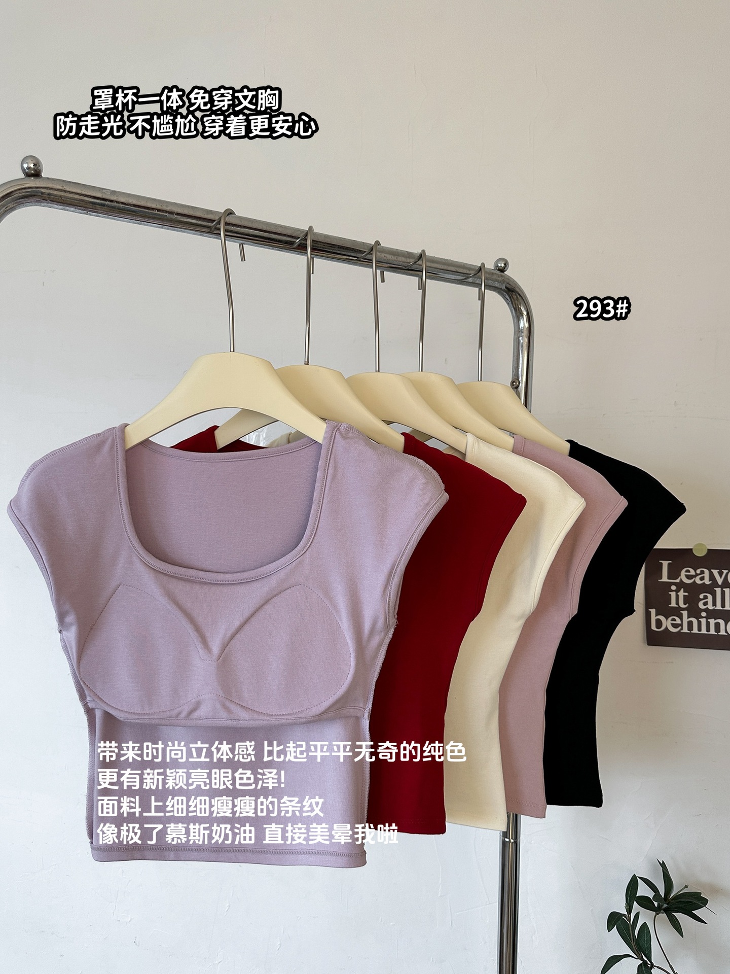 300 # 早秋新作正肩毛丸襟一体カップ小飛袖ショートベストtシャツ