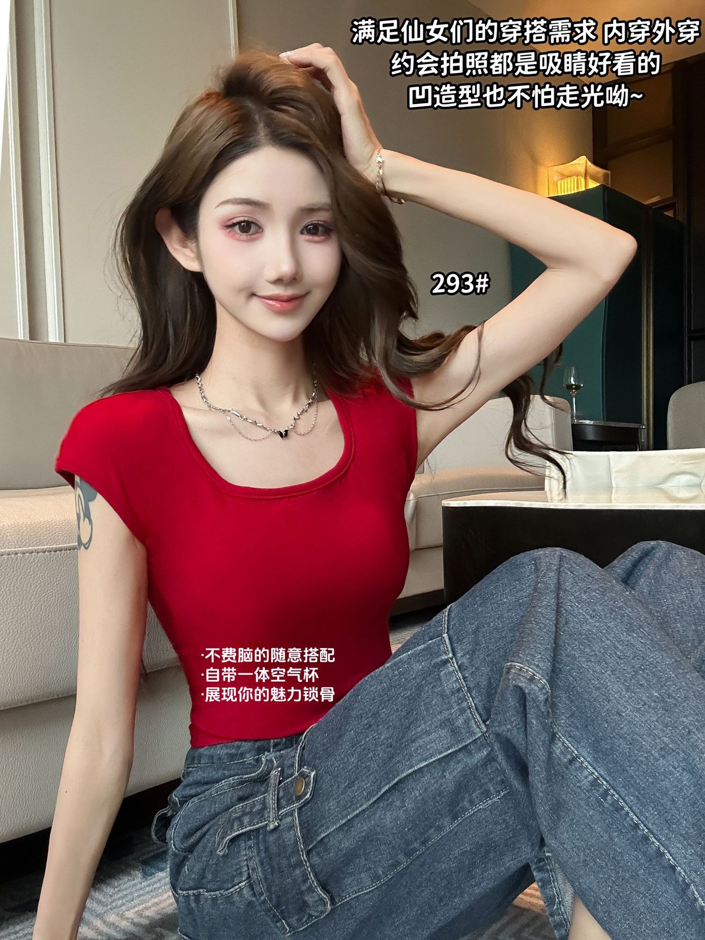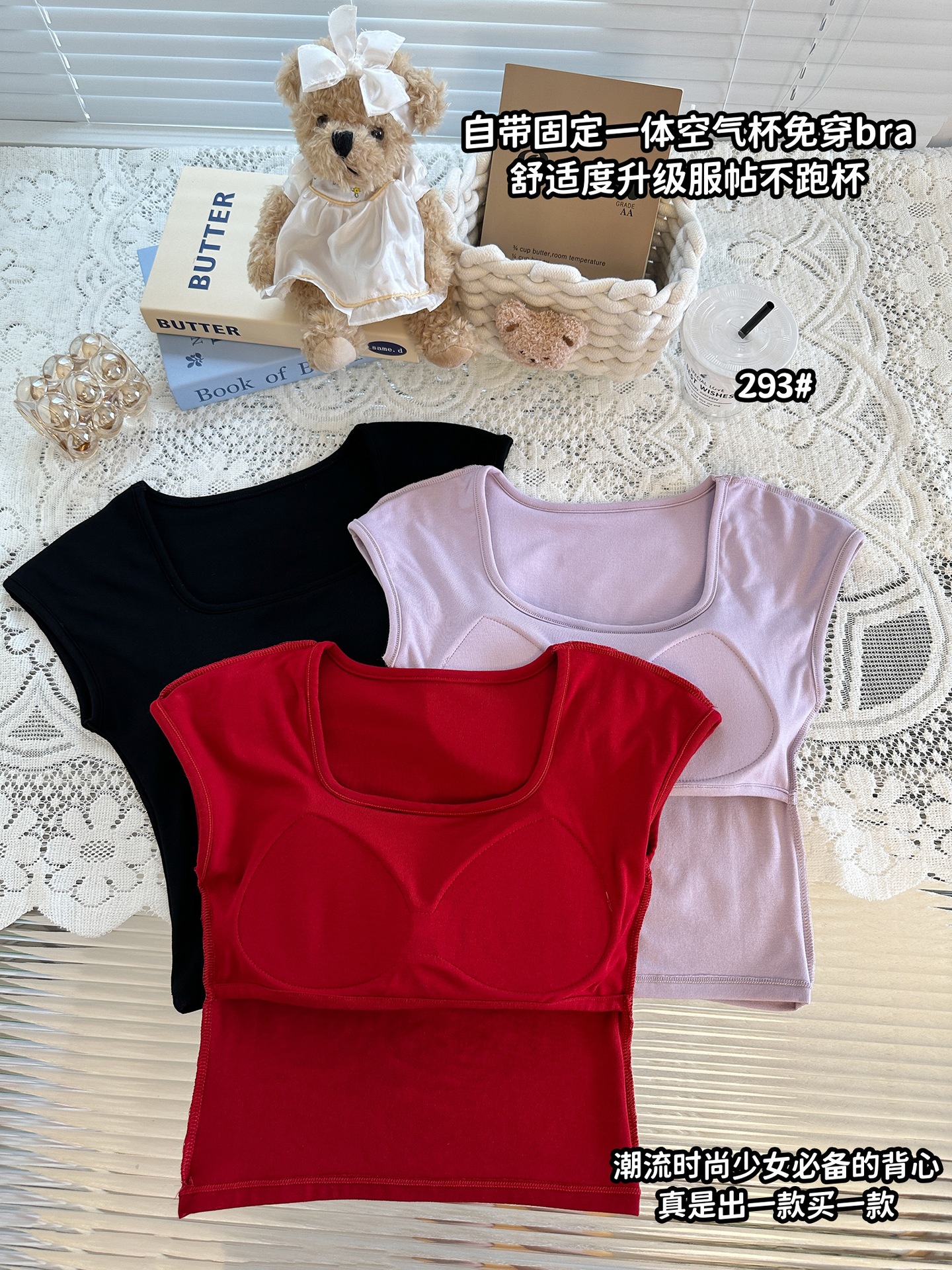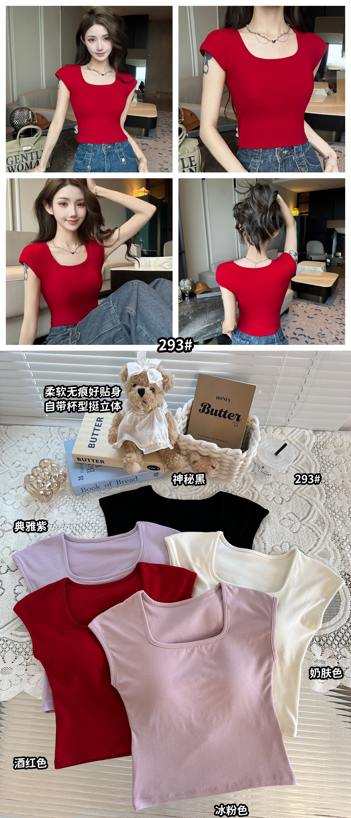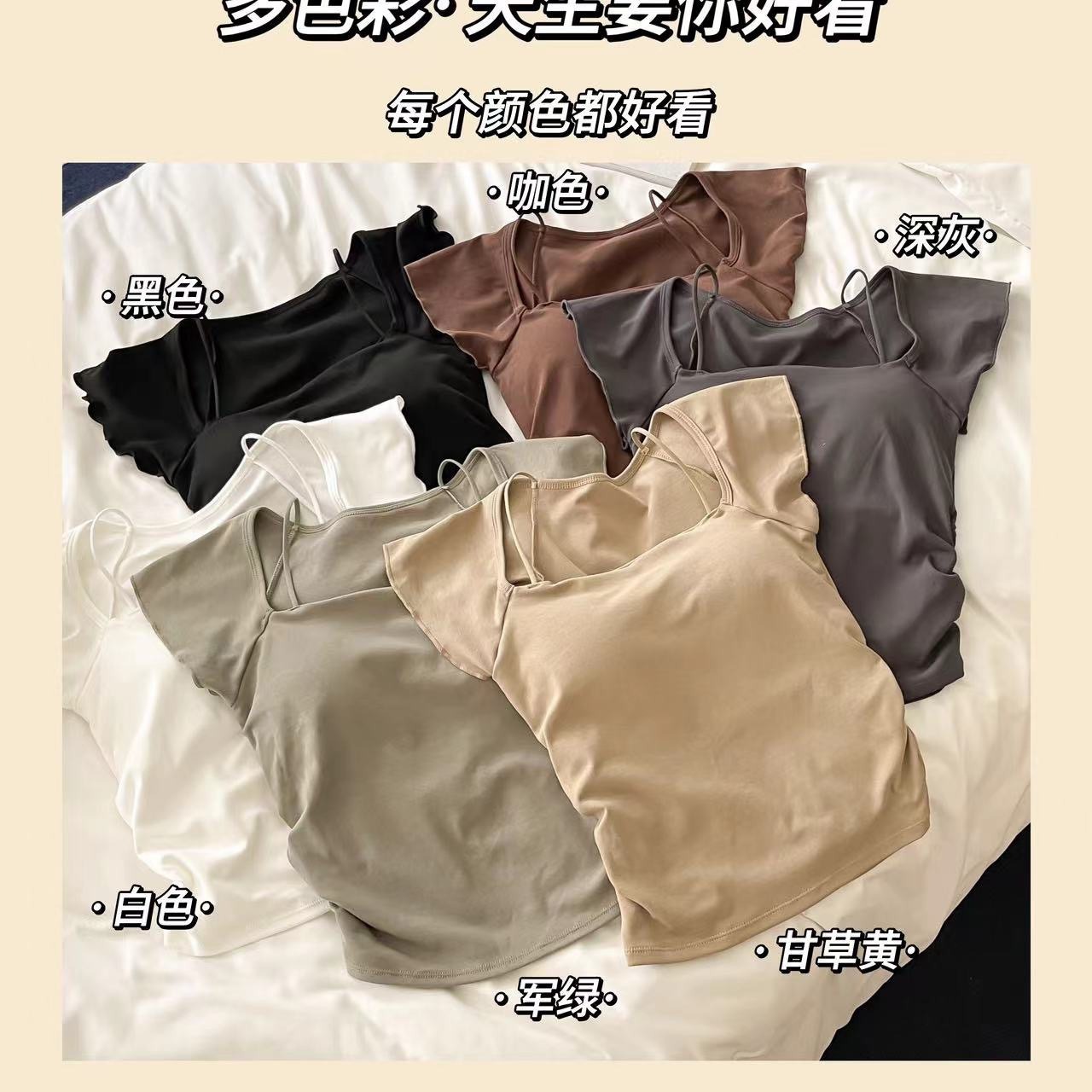 300 # 早秋新作正肩毛丸襟一体カップ小飛袖ショートベストtシャツ