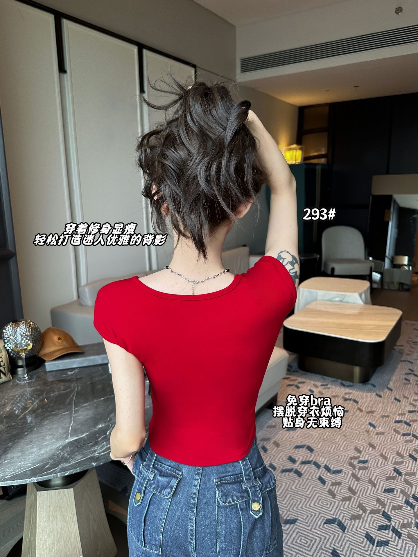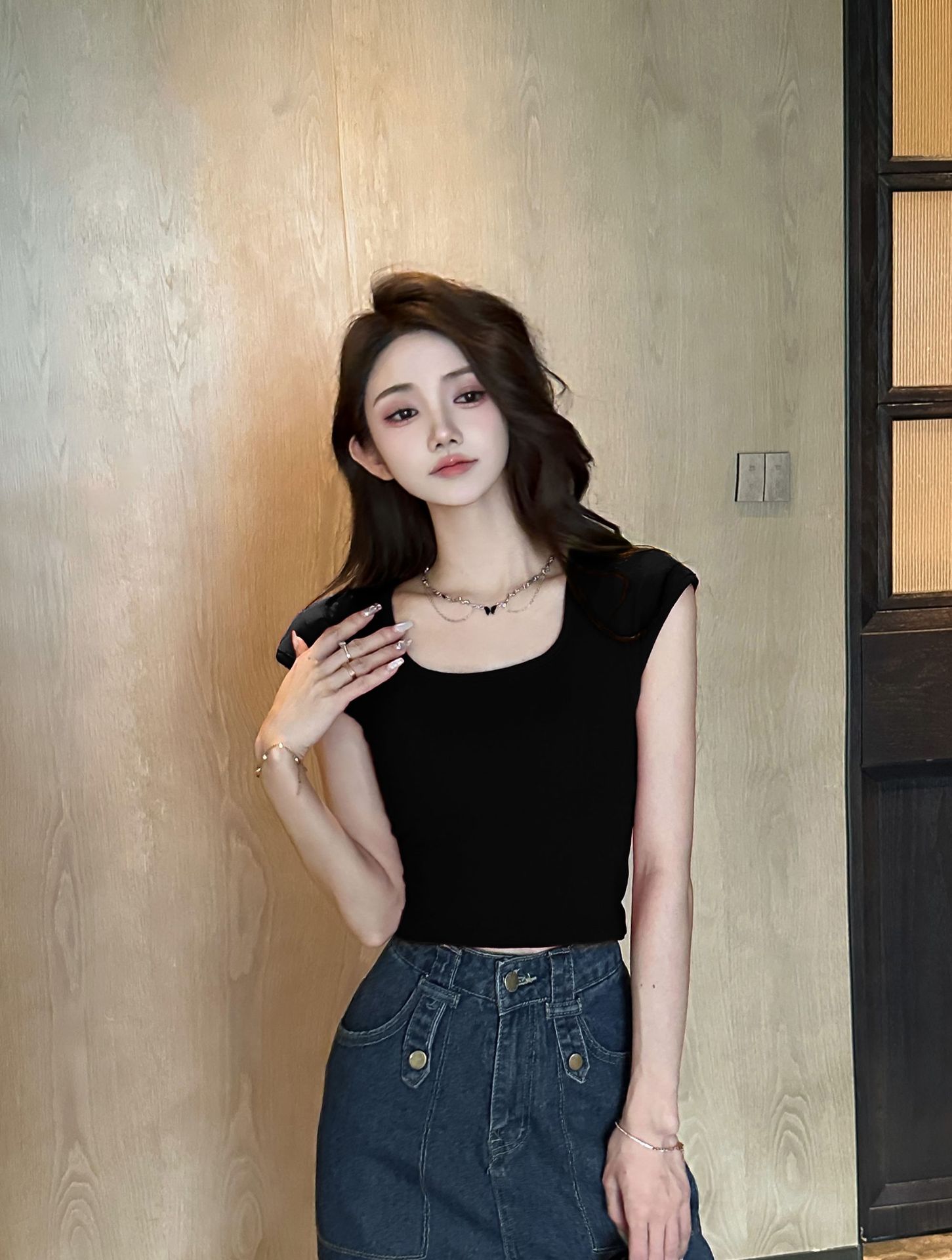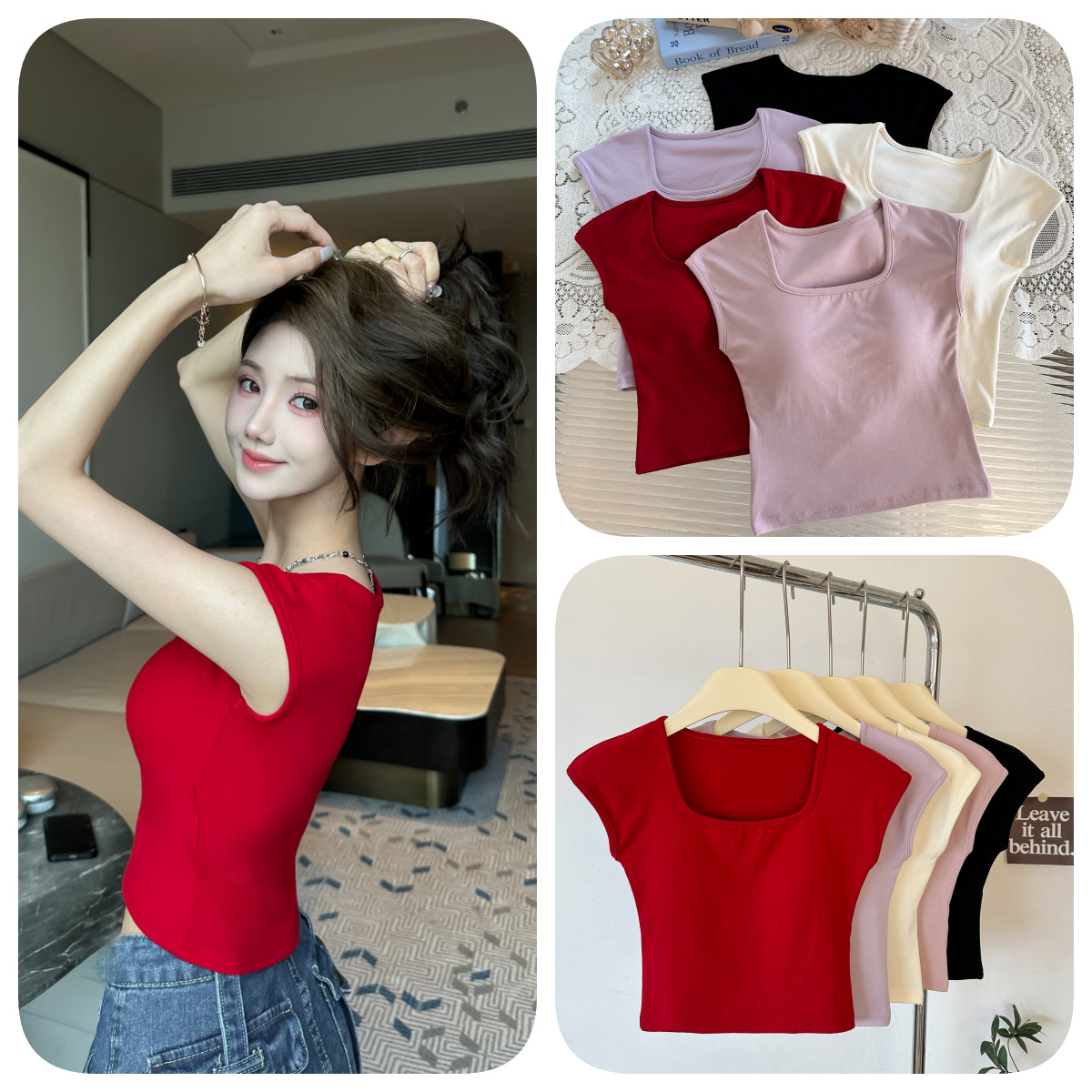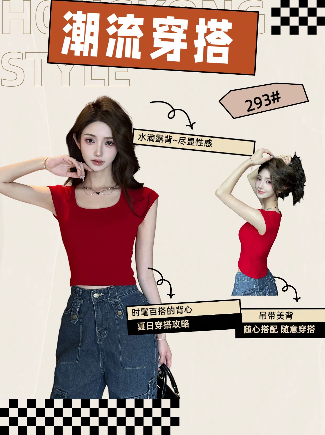 300 # 早秋新作正肩毛丸襟一体カップ小飛袖ショートベストtシャツ