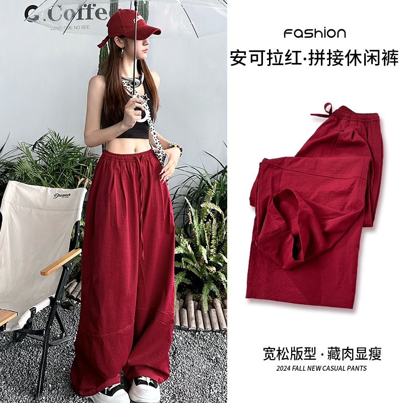 アメリカ風速乾ワイドパンツ レディース 2026春新作 ハイウエスト ゆったり カジュアルパンツ ドレープ感 レッド カジュアルスポーツパンツ