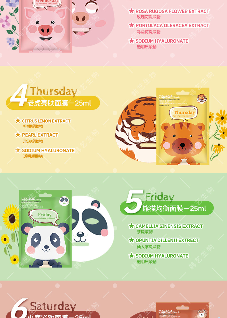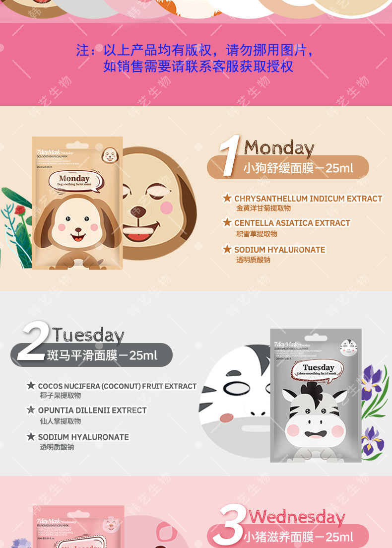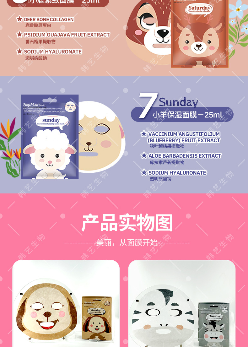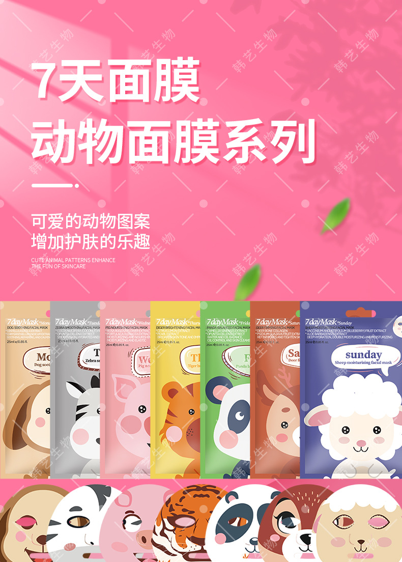 7天卡通动物面膜,7款产品的FDA和产品检测报告齐全,需要图片包和报告资料包请联系客服