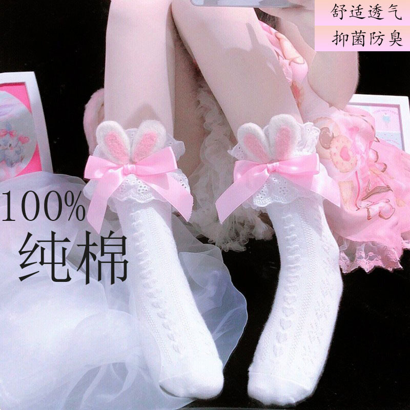 软妹洛丽塔纯棉蝴蝶结花边可爱兔耳朵Lolita短筒堆堆袜子女夏薄