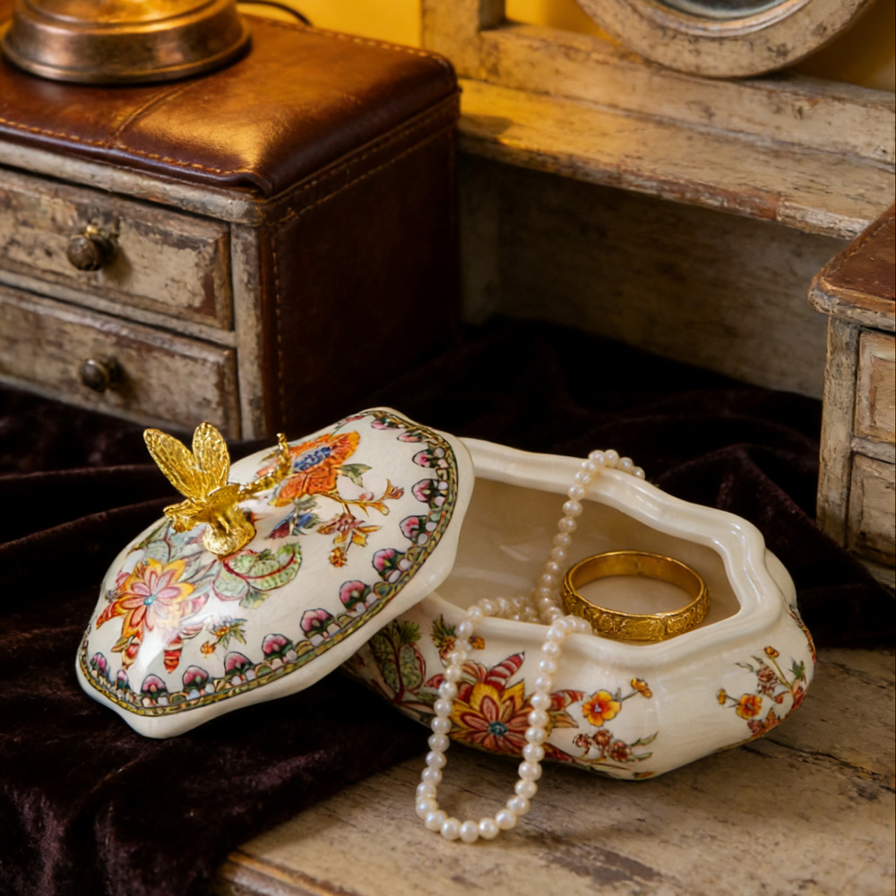 创意美式复古陶瓷首饰盒 创意冰裂纹陶瓷搭配合金蜻蜓