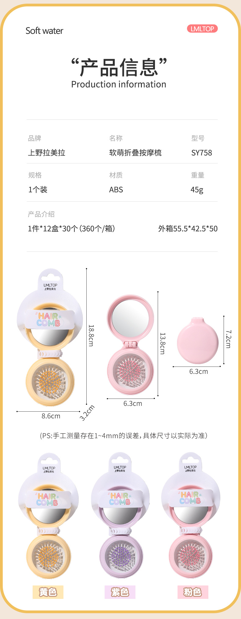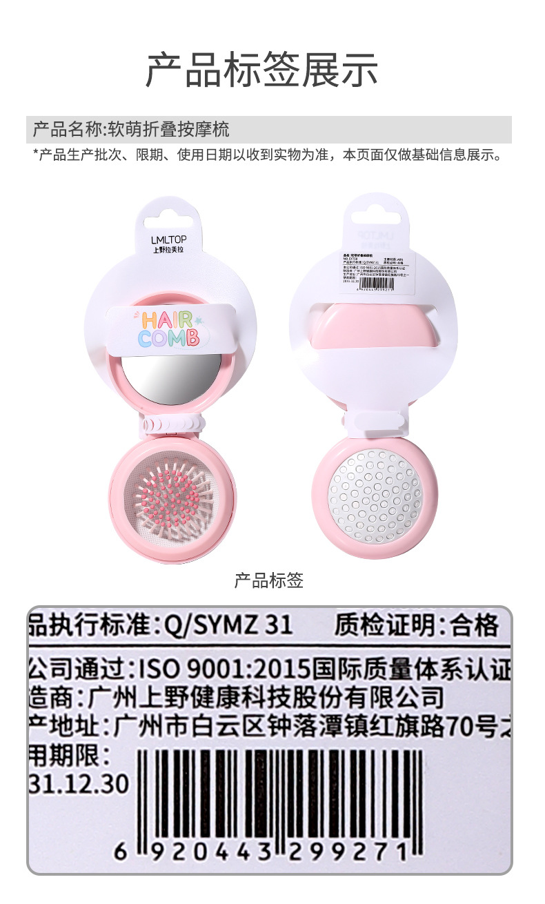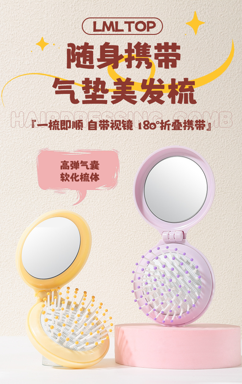 ラメラかわいい折り畳み鏡付き携帯櫛小型携帯折り畳み式学生マッサージエアマット櫛