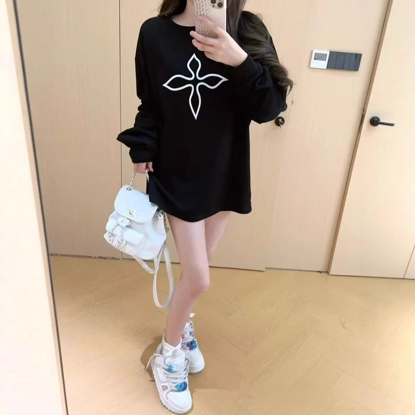 现货SK黑玉兰长袖打底衫上衣时尚十字印花阔身休闲纯棉套头卫衣女