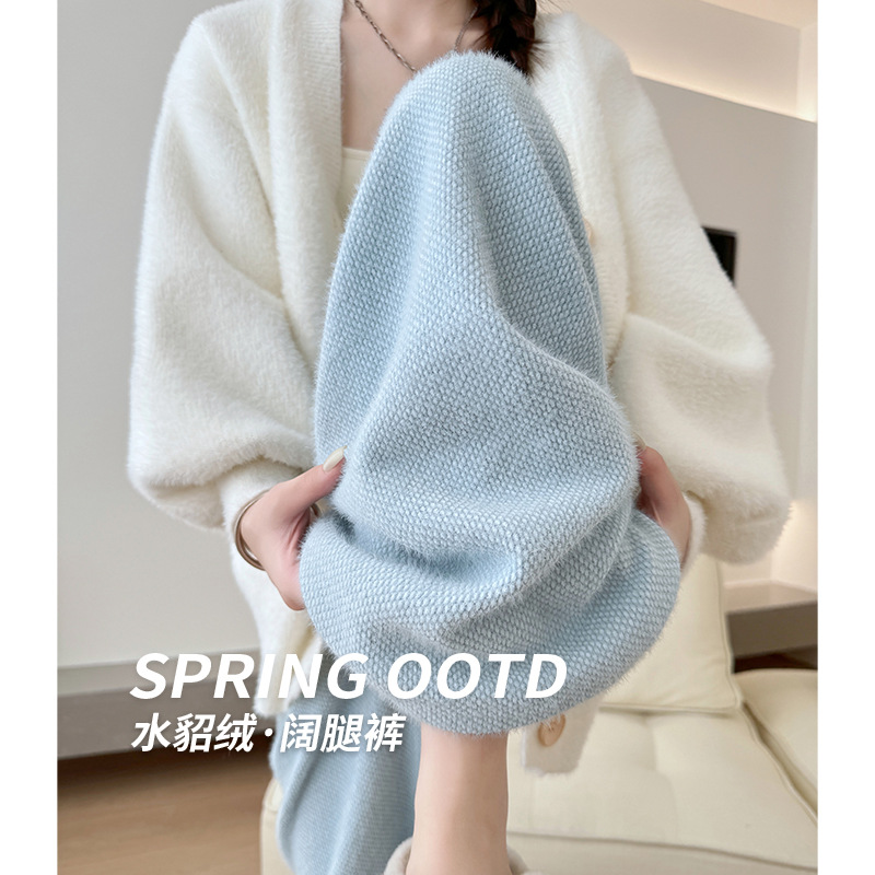ブルーニットワイドレッグパンツ女性のための春と秋2025新しいハイウエストカジュアルナローストレートパンツミンクベルベットもち米パンツ