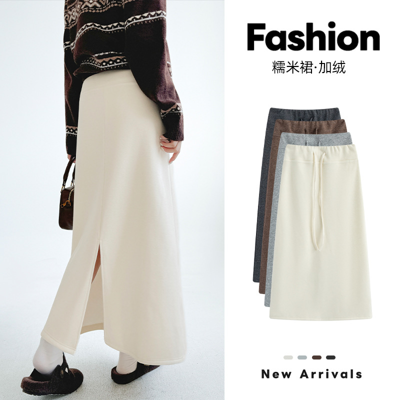 白色加绒半身裙女秋冬新款高腰垂感小个子a字裙开叉中长款糯米裙
