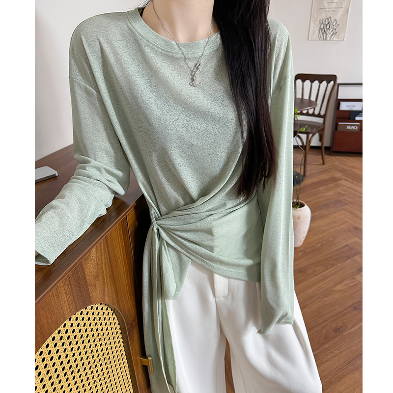 氷の糸の薄い紗の日焼け止めのブラウスの女性の夏の新型の外はデザイン感の長袖のtシャツを着てカジュアルにウエストの上着を結びます。