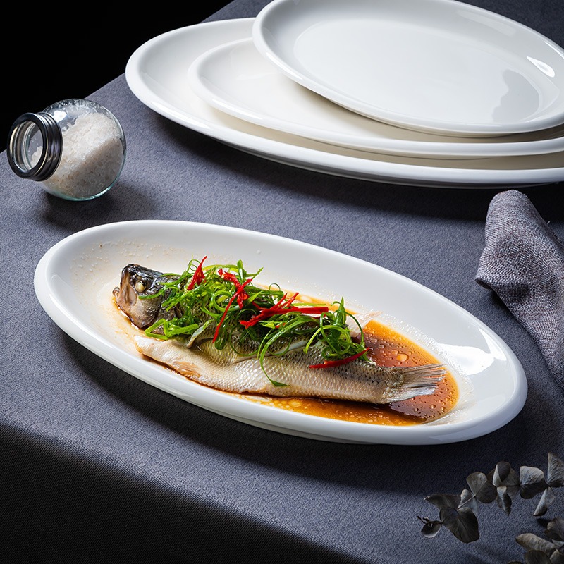 魚の皿は家庭用の新型陶磁器の純白蒸し魚の皿の厚い辺の楕円形のレストランのご飯のホテルの食器を厚くします。