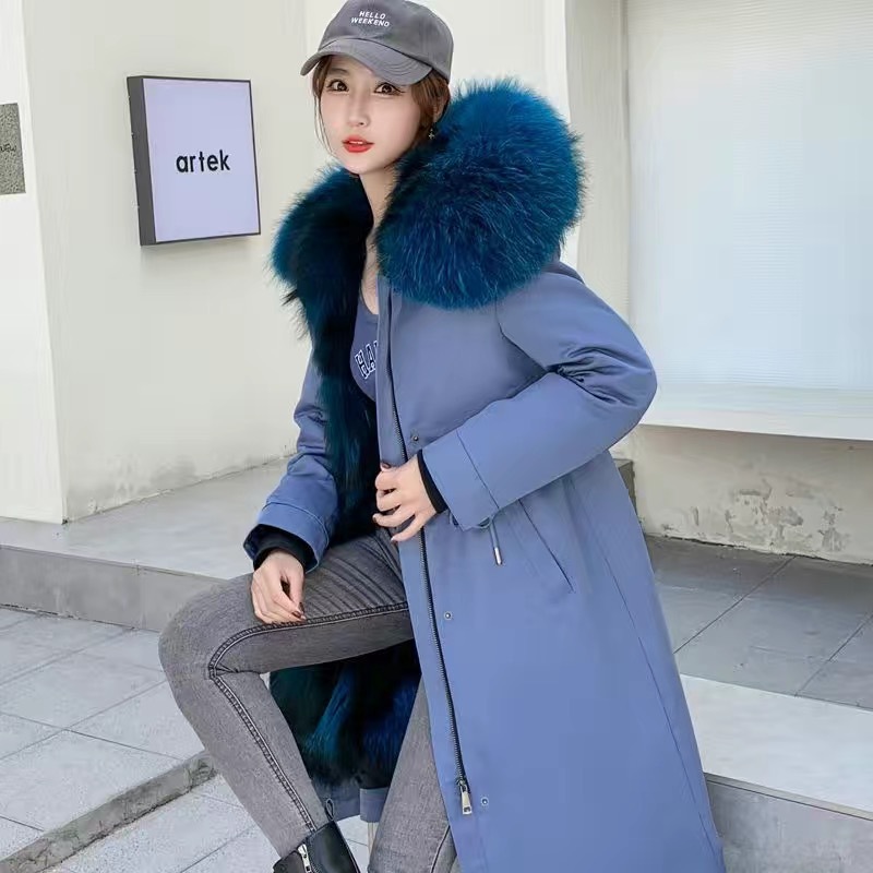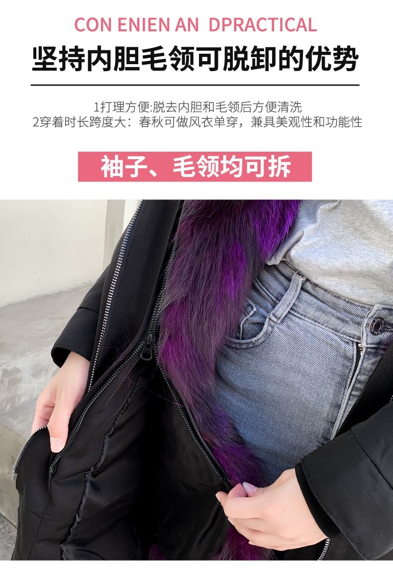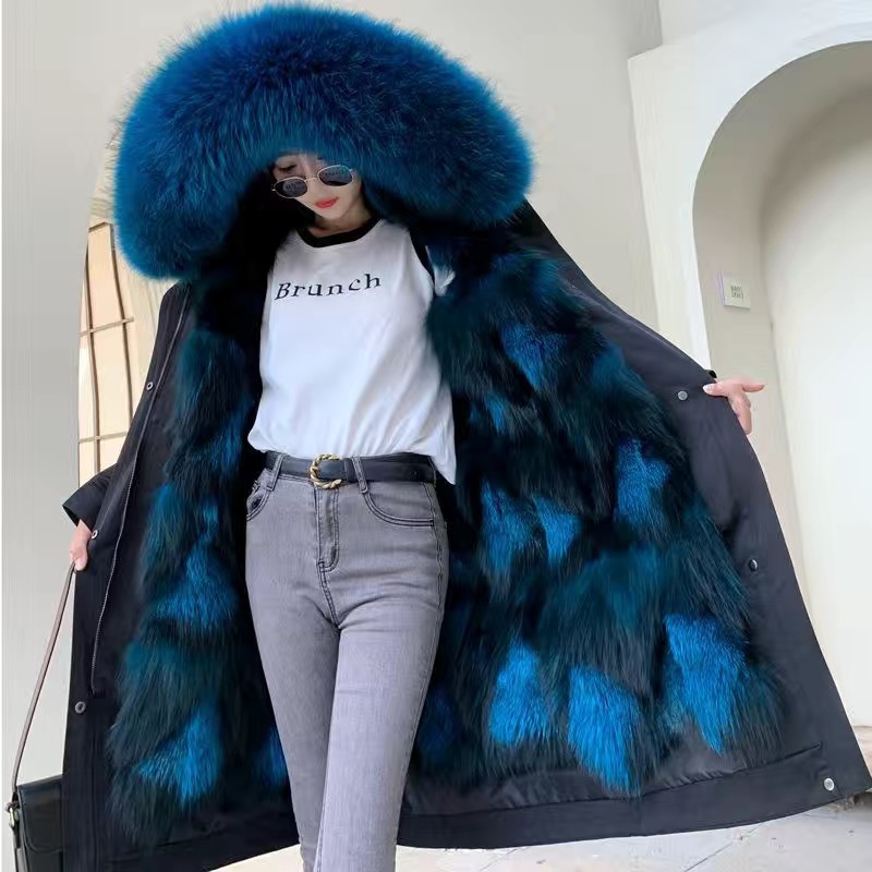 パーカー服の新型の婦人服のコートのキツネの毛の孔雀はスクリーンの中の大胆さを開けて長いタイプのダウンジャケットの女性の長いタイプを取り外します。