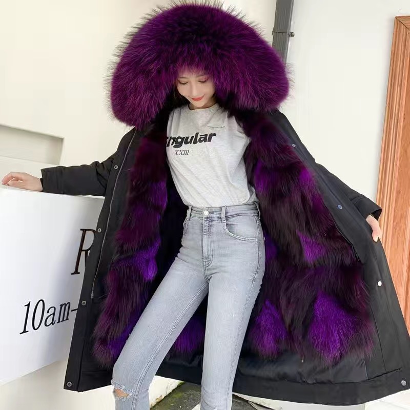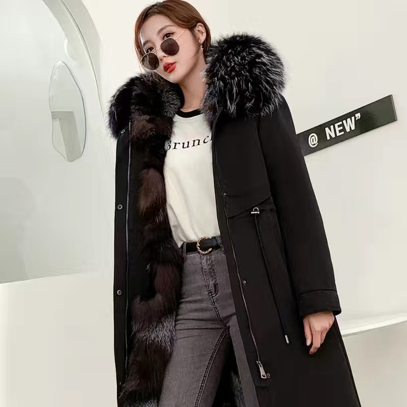 2025年冬 フォックスとラクーンの毛皮を使用したインナーライナー付きパーカー レディース ミドル丈 パーカーコート ファーコート