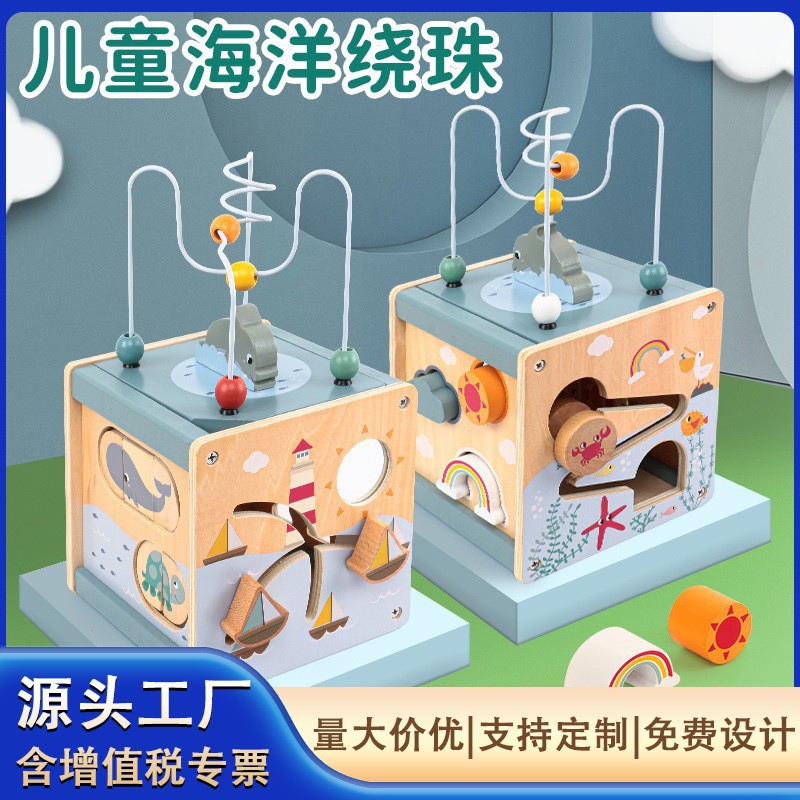 子供の木の海洋の森林の趣味の四面は玉の多機能の百宝箱の益智の数珠の形の認知のおもちゃを巻きます。
