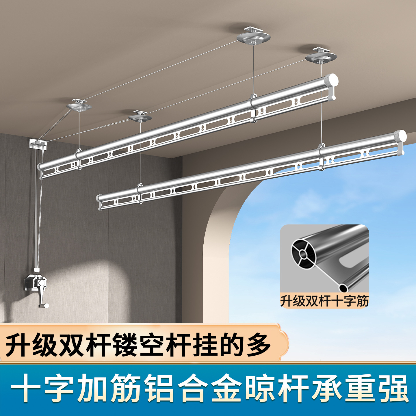 手動式物干しラック、昇降式二重棒式ベランダ物干しラック、厚みのあるアルミニウム合金製単棒式物干し竿、手動式物干し