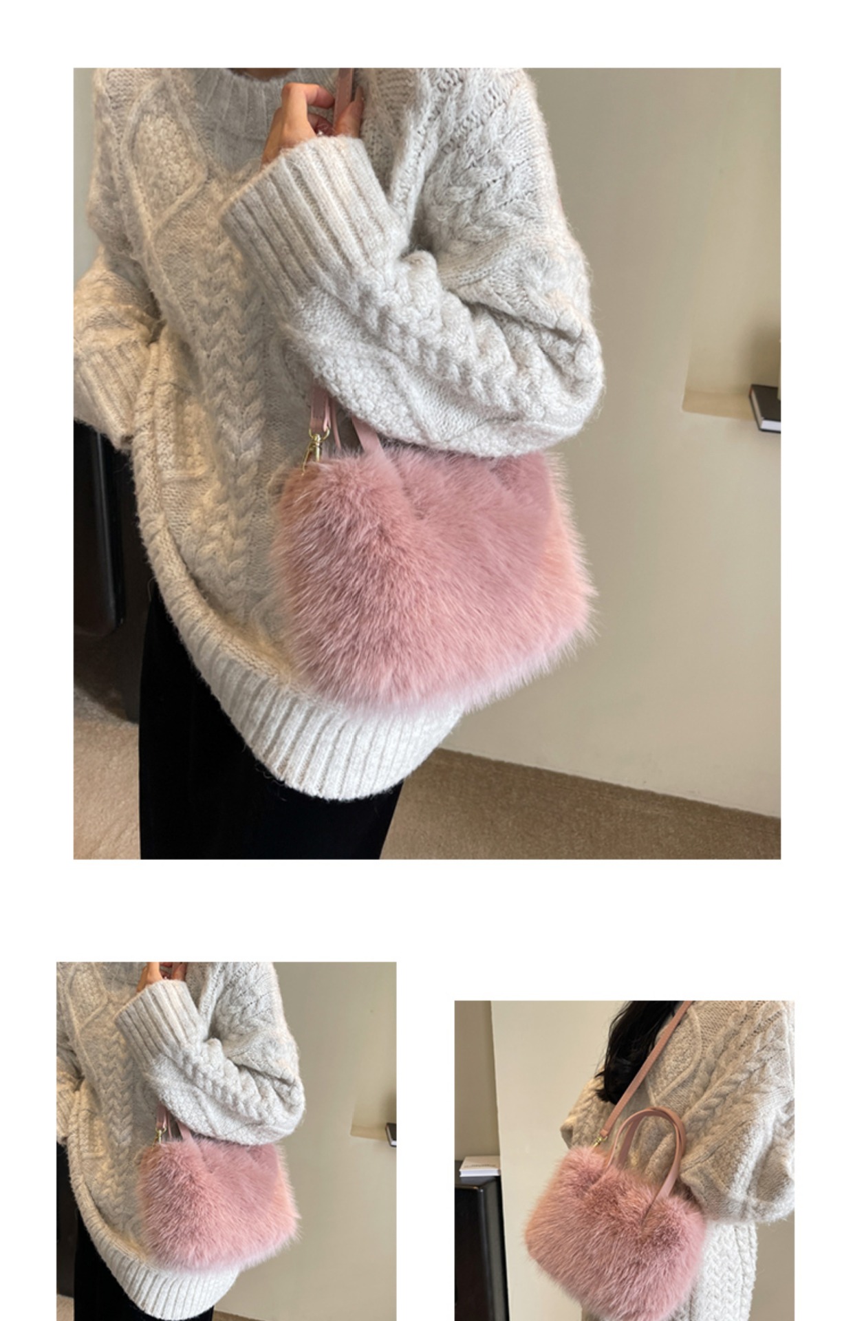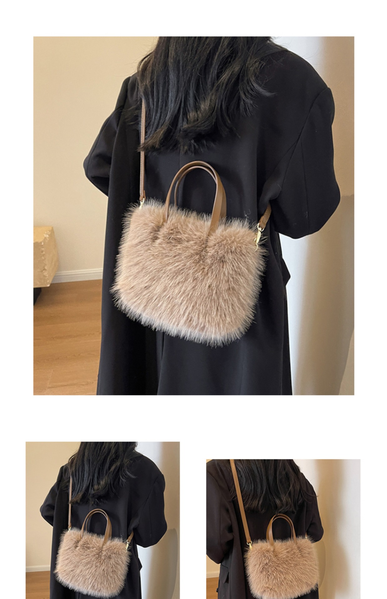 現物は毛のふわふわした手提げバッグを提供しています。