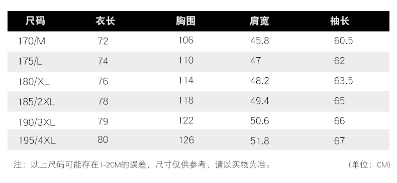 170/エム (50-60kg),175/L (60-70kg ),180/XL (70-77.5kg ),185/XXL (77.5-85kg 年),190/XXXL (85-95kg 年),195/XXXXL (95-102.5kg 年)