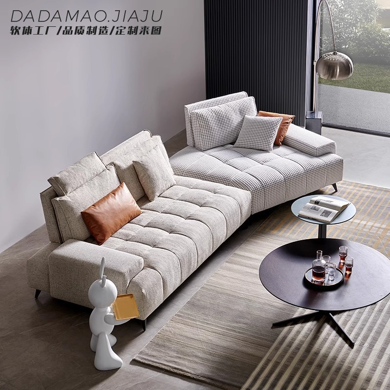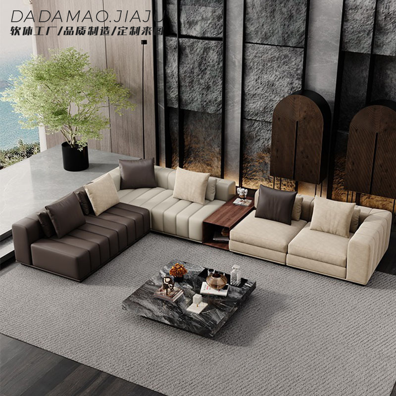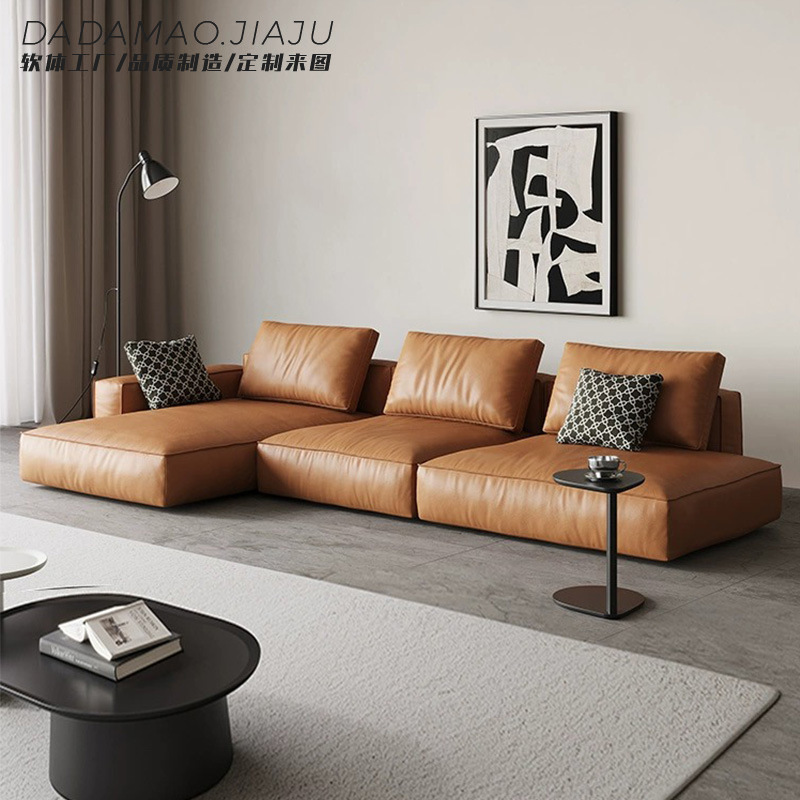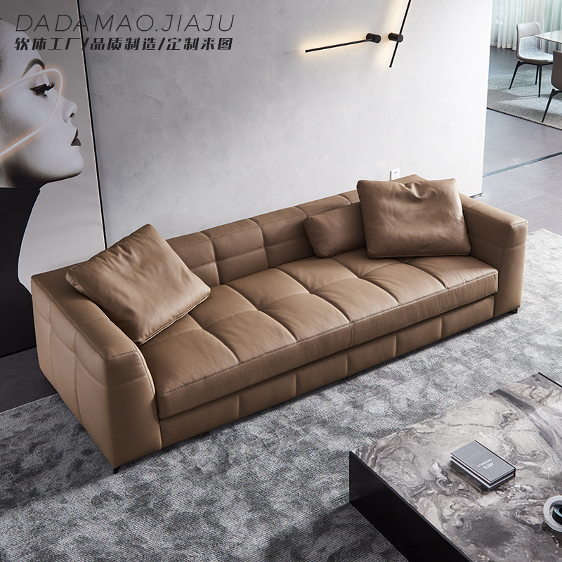 イタリアンスタイルのレザーダウンソファ、大型リビングルーム用、モダンレトロなレイジーストレートコーナーコンビネーション豆腐ブロックソファ