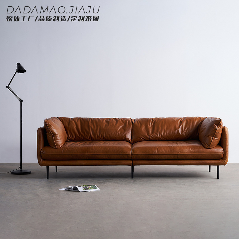 北欧風オイルワックスレザーソファ、小型住宅向け、イタリア風ミニマリストデザイン、3人掛け、レトロ・ヴィンテージ風レザーソファ