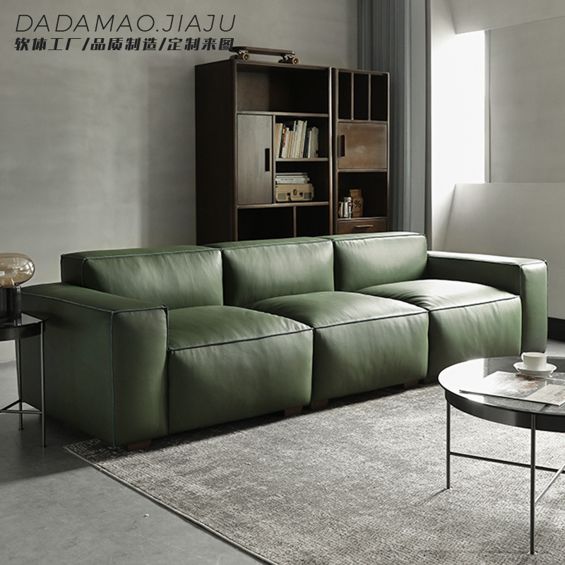 ネットで話題の本革黒牛革ソファ、大型イタリアンスタイルの軽奢なオリジナルダウン入り高級粒面厚手グリーンレザーソファ